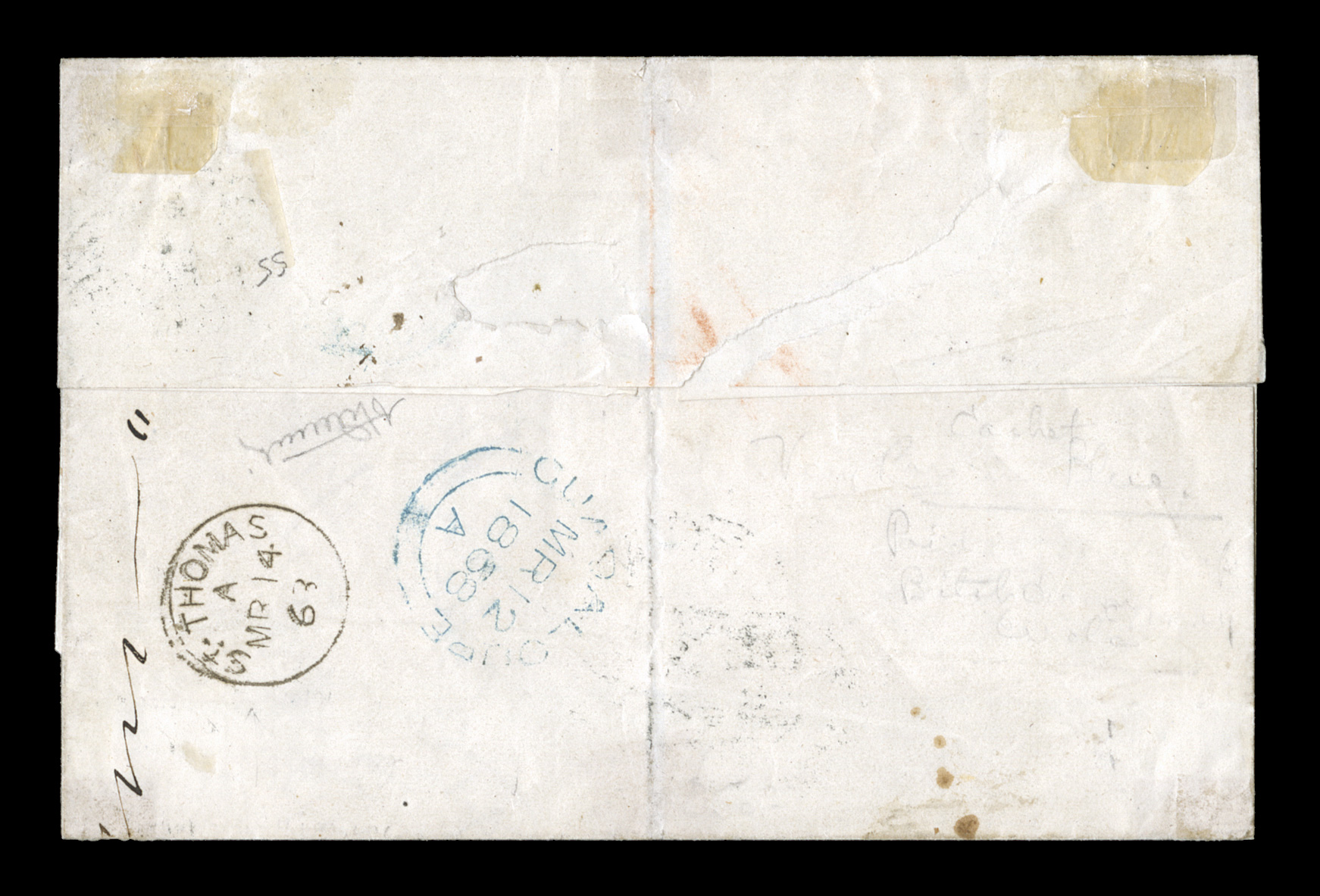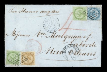 10c and 20c, an exceptionally attractive three-color franking payingFrench Colonies Yvert #2, 3, 4, 1859-65, 5c Green, 10c Yellow bister and 20c Blue, singles of each including two examples of the 5c, large margins to just in on one side of the 10c and 20c, an exceptionally attractive three-color franking paying the reduced rate to New Orleans, tied to folded cover by black 7x7 point lozenge cancels, with a black "Guadeloupe/Pointe-a-Pitre/12 Mars 67" double-circle c.d.s., light, but clear, strike of the very rare "Paid/at/Guadaloupe" Crowned-circle handstamp of the British Agency, "4" pence British rate marking in red crayon, red British "Guadaloupe/MR 13 1867" double-arc c.d.s. and small black St. Thomas transit c.d.s. on the reverse, small black "Steamship/10" circular entry handstamp on arrival in the United States for 10c ship fee due, light vertical file fold affecting the two 5c values but not affecting the very fine appearance of this cover; a lovely cover with considerable eye appeal as well as an extremely rare Crowned-circle paid cover to the United States via the British Agency. (imagea) (Image) Est. $3,000-4,000