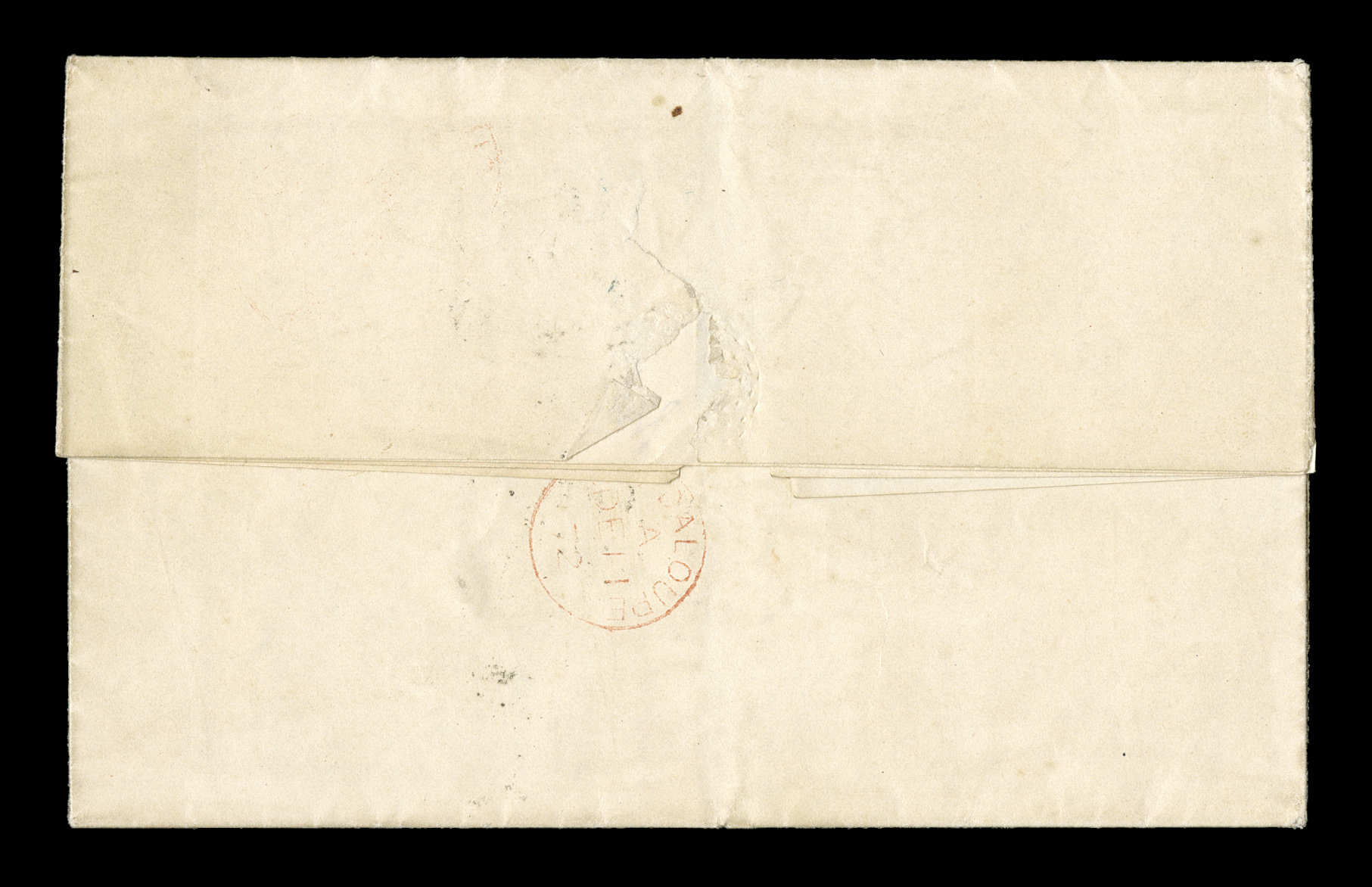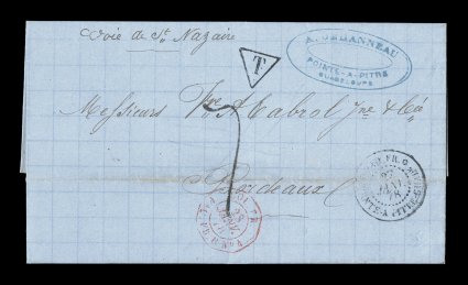 B red entry transit, T in triangle and 7 due handstamps fo1878 Pointe-a-Pitre unpaid entire letter to France with black "Paq. Fr./Pointe-a-Pitre Guade./27 Janv. 78" double-circle sorting c.d.s., carried by French packet with octagonal Line "B" red entry transit, "T" in triangle and "7" due handstamps for 7 decimes to be collected, slight soiling along file fold, very fine and choice; this cover illustrates the ability to send letters to France unpaid during the U.P.U. period and the normal practice would be to charge double the prepaid amount which makes this cover quite unusual as this was during the 40c U.P.U. rate period needing 8 decimes to be double, the 35c period not starting until May 15, 1878. (imagea) (Image) Est. $200-300
