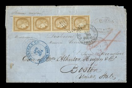 at left, tied to 1874 folded cover to Boston by single black lozengeFrench Colonies Yvert #22, 1872 15c Bister vertical strip of four, an especially handsome strip possessing large to huge margins all around showing a portion of the sheet margin at left, tied to 1874 folded cover to Boston by single black lozenge cancel, black "Guadeloupe/Pointe-a-Pitre/10 Avril 74" small c.d.s., rare British Agency "Guadaloupe/Paid/AP 11 74" double-circle c.d.s., "4" pence British rate marked in red crayon, plus small red British "Guadaloupe/AP 11 74" c.d.s. on the reverse, "New York/U.S. Currency/Apr 20/Due 10" c.d.s. applied on entering the United States also tying the strip, edge wear to the cover rounding the top right corner, not affecting the stamps or markings, otherwise very fine; an attractive franking on this rare posting; signed R. Calves. (imagea) (Image) Est. $500-750