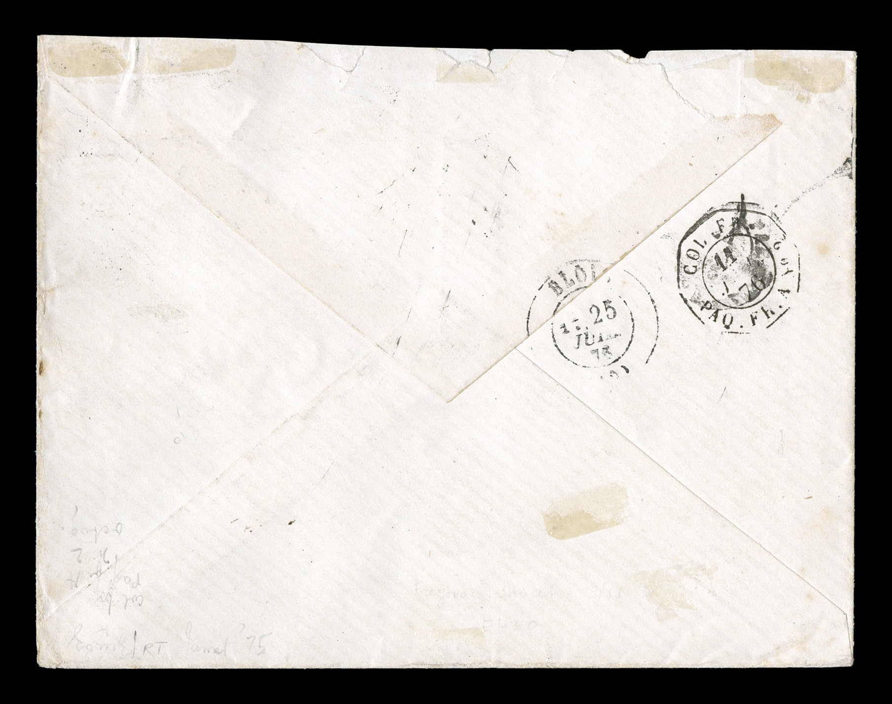 to France by Paq. Fr.Pointe-a-Pitre Guade11 Janv. 79 double-cirFrench Colonies Yvert #18, 23a, 1872-76 10c Brown on rose and 25c Blue, Ty. III, attractive singles with just clear to large margins all around, tied to 1879 entire folded letter to France by "Paq. Fr./Pointe-a-Pitre Guade/11 Janv. 79" double-circle sorting c.d.s. with an additional strike at right, blue St. Nazaire entry transit, portion of Marseilles backstamp, very fine; a nice combination used at the end of the 35c U.P.U. rate that was in effect from May 15, 1878 to February 15, 1879. (imagea) (Image) Est. $300-400