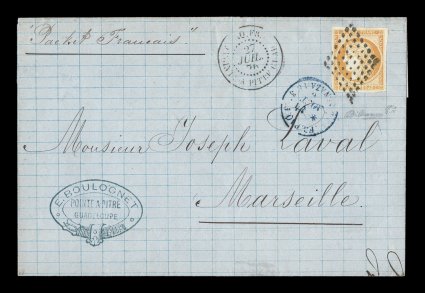 to France by perfectly struck black 8x8 point lozenge cancel, nicFrench Colonies Yvert #13b, 1871 40c Orange, variety with recut "4", a gorgeous single of this rare variety with four large balanced margins, beautifully tied to clean folded cover to France by perfectly struck black 8x8 point lozenge cancel, nice strike of "Paq. Fr./Pointe-a-Pitre Guade/27 Juil. 76" double-circle sorting c.d.s., blue St. Nazaire entry transit, backstamped Marseilles, very fine and exceedingly choice; the rare variety of the 40c Ceres with large "4" in the lower value tablet is found on only two positions at the bottom of the plate (positions 146 and 147), this retouching gives the "4" a very distinctive configuration that some catalogs have listed as Type II, this example is an especially choice single on a lovely cover illustrating the new single U.P.U. rate of 40c for foreign mail shortly after it was instituted on July 1, 1876 for Guadeloupe; an extremely rare cover; signed Roumet, Dillemann. (imagea) (Image) Est. $1,500-2,000
