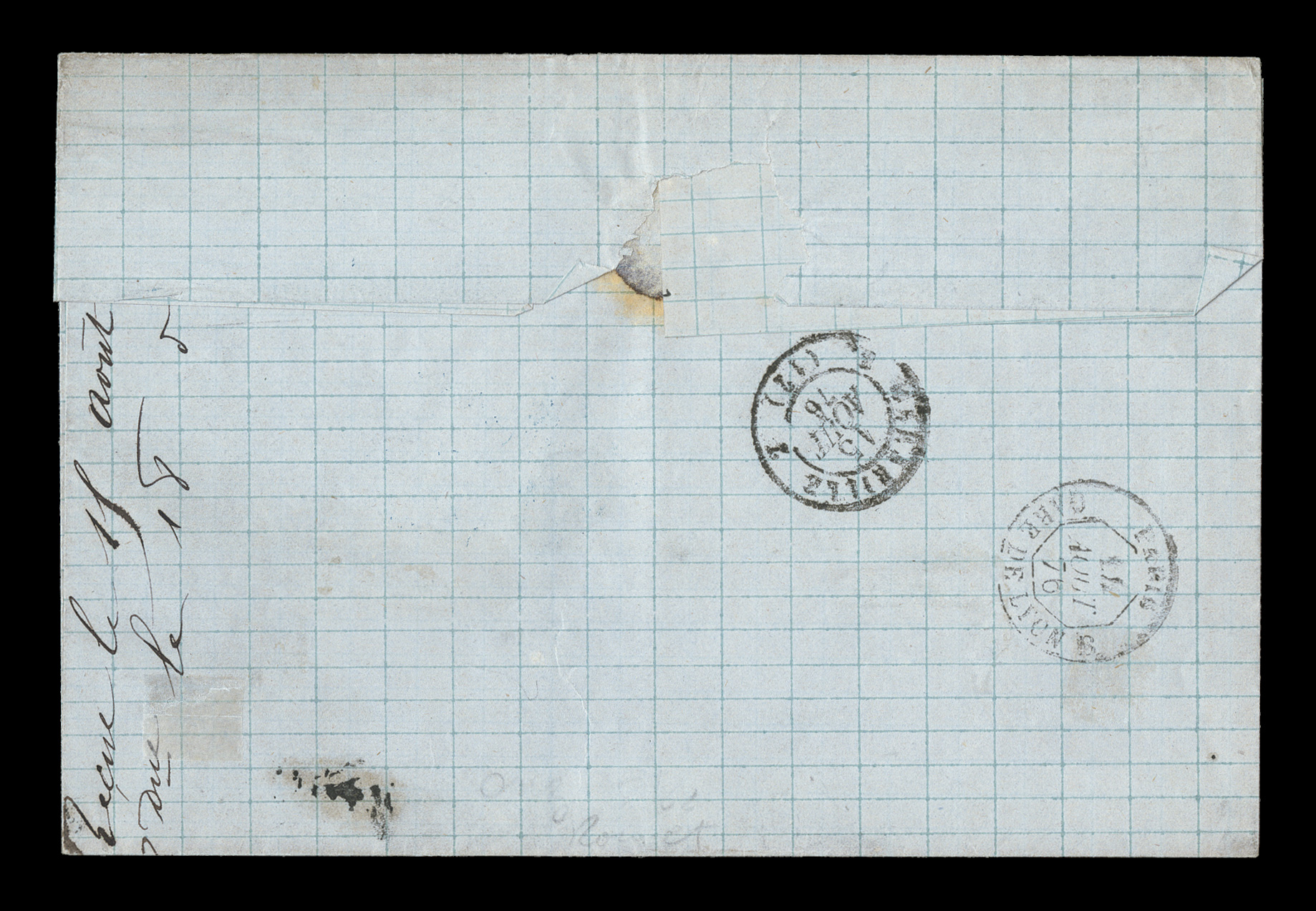 Fr.Pointe-a-Pitre Guade14 Juil 76 double-circle sorting c.d.s., octagonFrench Colonies Yvert #6, 1865 80c Rose, attractive single with four large even margins, neatly tied to double-rate cover to France by black lozenge cancel, matching "Paq. Fr./Pointe-a-Pitre Guade/14 Juil 76" double-circle sorting c.d.s., octagonal French packet transit on the reverse, backstamped Bluis, light edge wear to the cover with trivial nicks at top, very fine; this rate of 40c per 15 grams, which was put in effect on July 1, 1876, was the only rate that a single 80c value would properly pay the double rate, however this required a very late use of the Eagle issue; a rare single franking cover used in the first two weeks of the rate. (imagea) (Image) Est. $750-1,000