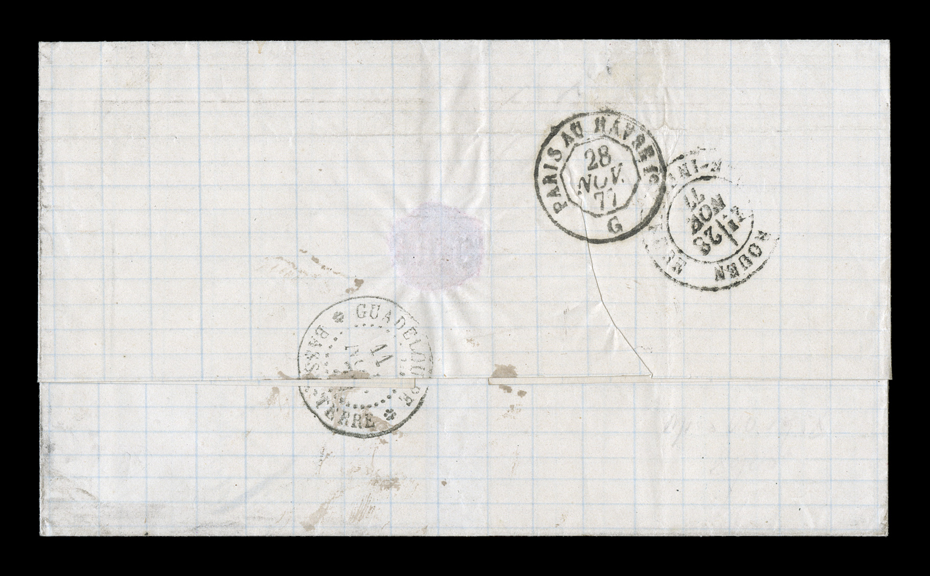 114 c 1878 Pointe-a-Pitre unpaid entire letter to France with black Paq. Fr.Pointe-a-Pitre Guade.27 Janv. 78 double-circle sorting c.d.s., carried by French packet with octagonal Line