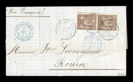 111 c Fr. Colonies Yvert #34 French Colonies Yvert 34, 1877 20c Lilac brown on buff horizontal pair, Ty. II, attractive franking with large balanced margins all around, tied to 1877 folded cover to France