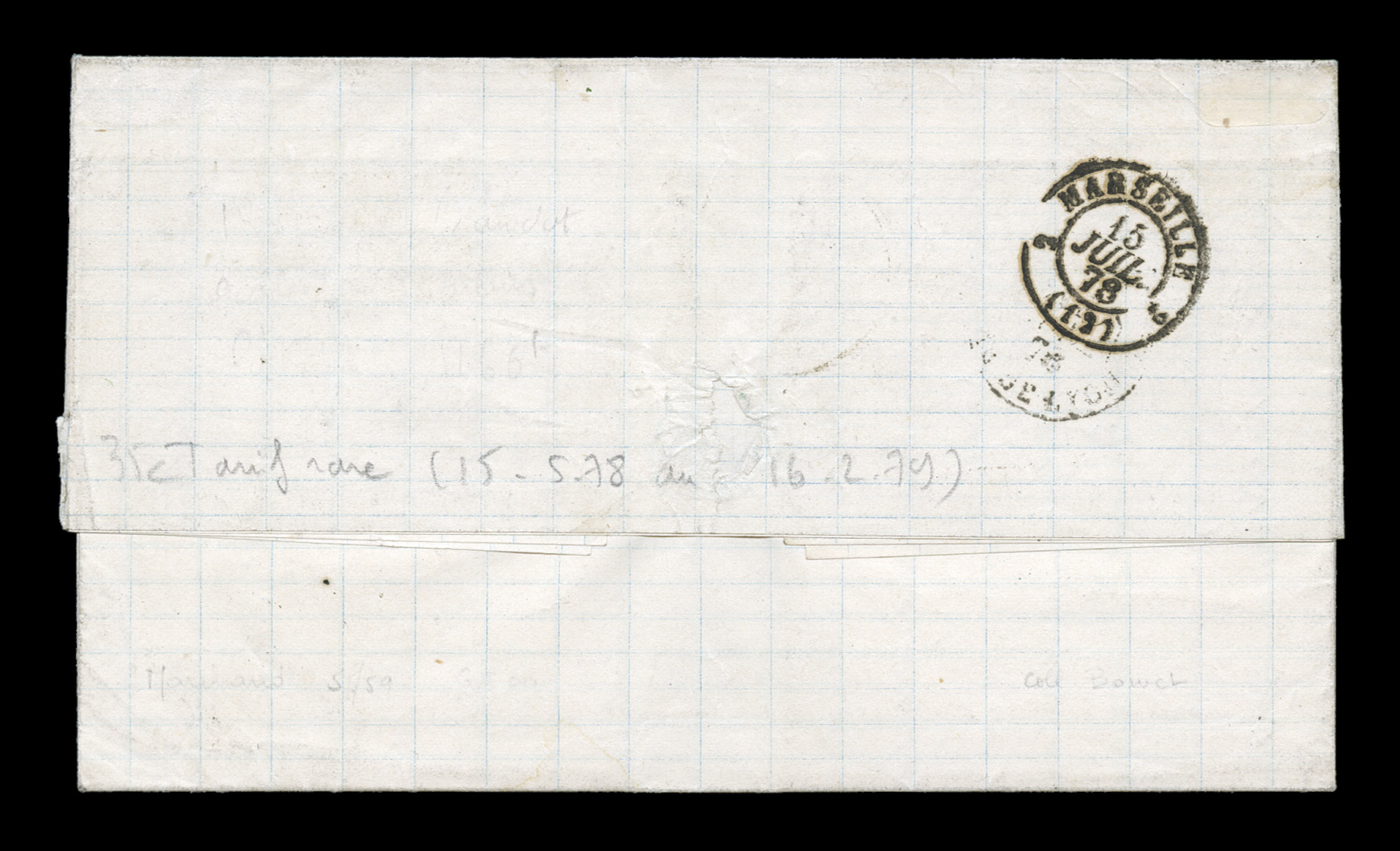 Ang.Pointe-a-Pitre Guade26 Juin 78 double-circle sorting c.d.s. with an adFrench Colonies Yvert #17, 20, 1872 5c Green on blue and 30c Brown, pretty franking each with mostly large margins, tied to 1878 entire folded letter to France by "Paq. Ang./Pointe-a-Pitre Guade/26 Juin 78" double-circle sorting c.d.s. with an additional strike at left, black Calais entry transit, backstamped Marseilles, very fine and an exceptionally attractive cover; this cover illustrates the new 35c U.P.U. rate that had just come into effect on May 15, 1878; since this rate lasted less than a year it is a rather difficult rate to find. (imagea) (Image) Est. $400-500