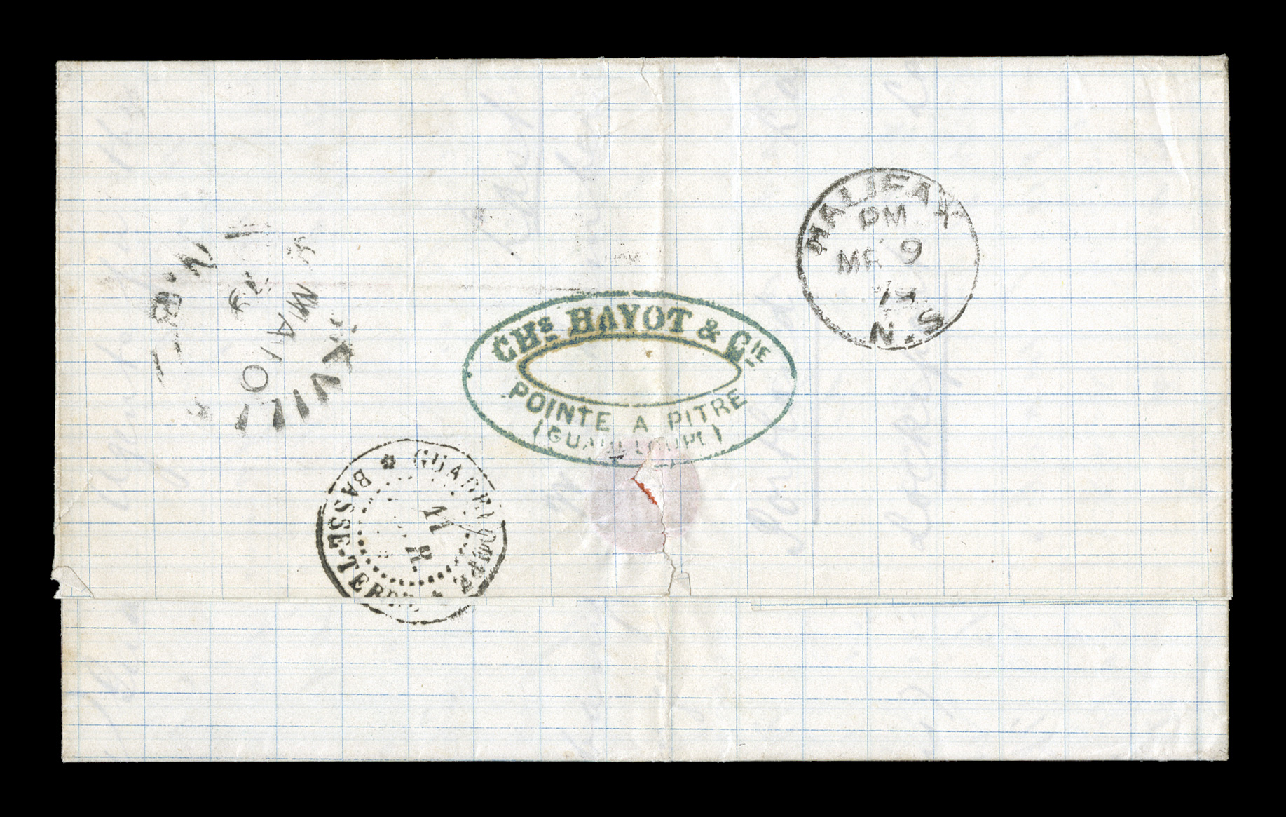 margined all around with a couple of partial scissors cuts between stFrench Colonies Yvert #17, 1872 5c Green on blue horizontal strip of five, impressive franking of a late usage of this value to pay the 25c U.P.U. rate to France, strip is well margined all around with a couple of partial scissors cuts between stamps, tied to 1880 entire folded letter carried by British packet by clear strikes of "Paq. Ang./Pointe-a-Pitre Guade./26 Mai 80" double-circle sorting c.d.s. with additional strike below, backstamped Mauze Dexu-Sevres, very fine and attractive; a very scarce franking. (imagea) (Image) Est. $750-1,000