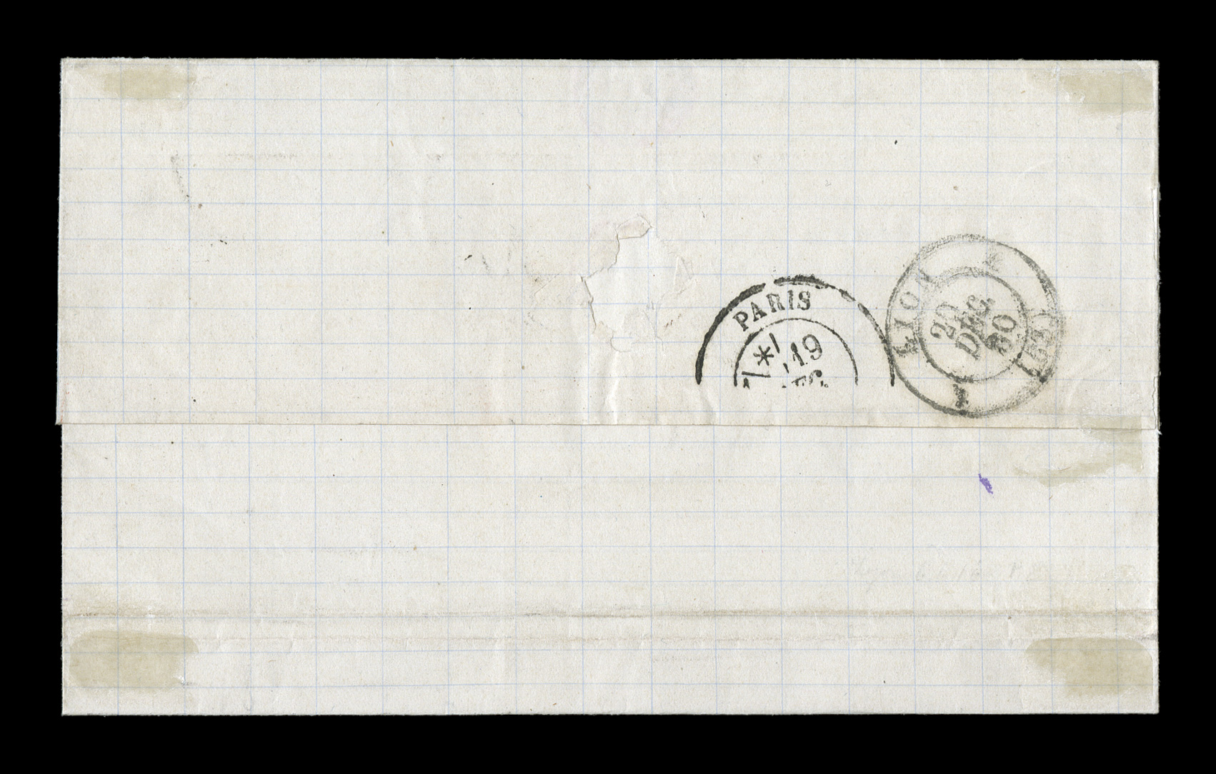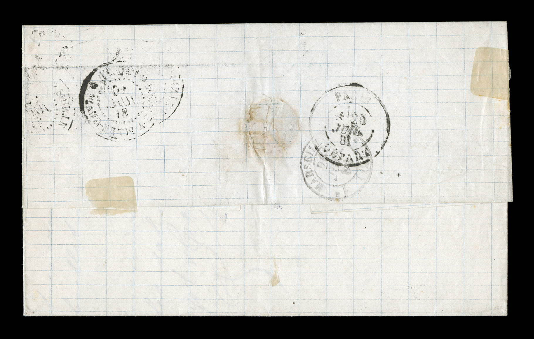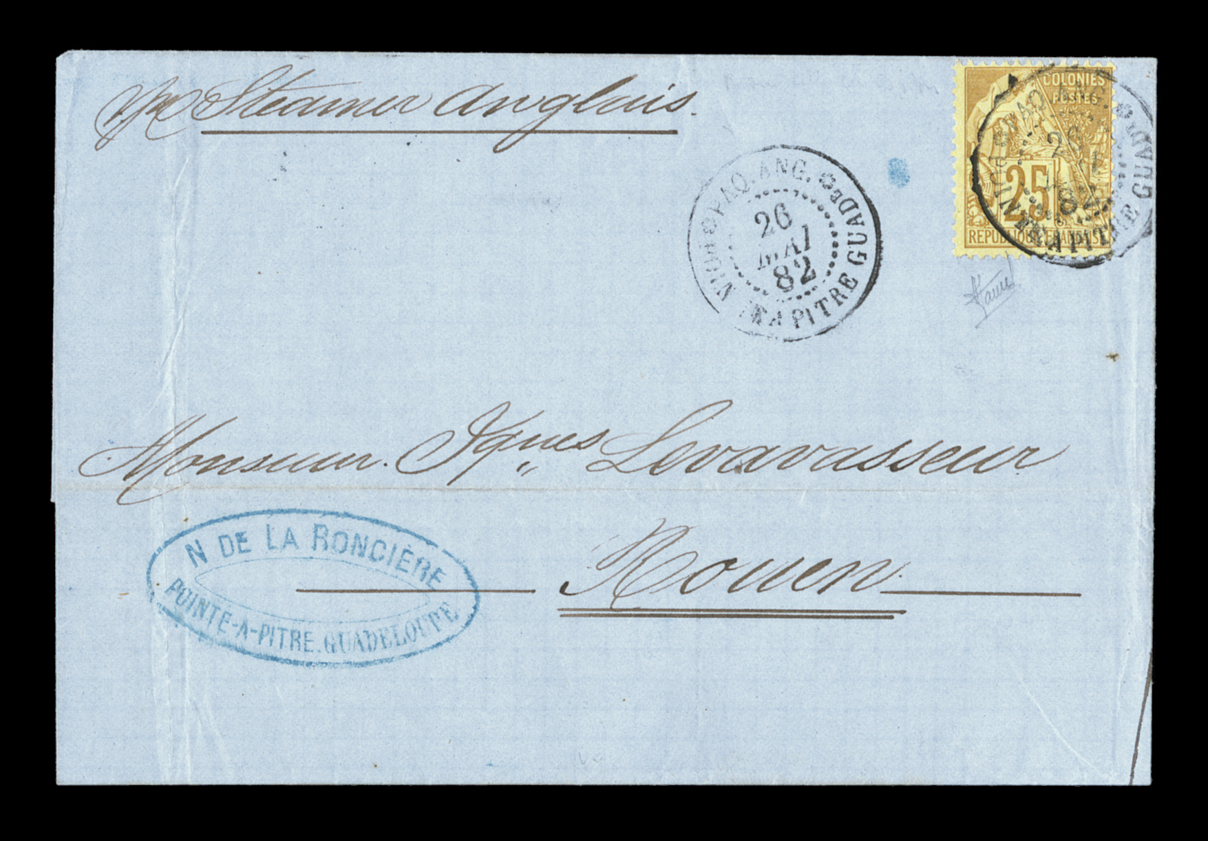 Guade26 Juin 79 double-circle sorting c.d.s. with an additional strikFrench Colonies Yvert #23a, 1872 25c Blue, Ty. III, attractive single with clear to large margins all around, tied to 1879 folded cover to France by "Paq. Ang./Pointe-a-Pitre Guade/26 Juin 79" double-circle sorting c.d.s. with an additional strike at left, carried by British packet with red Calais entry transit, backstamped Bordeaux, trace of tone spots to cover of no consequence, very fine; an early example of the 25c U.P.U. rate by British packet that went into effect on February 16, 1879 and thereafter. (imagea) (Image) Est. $150-200