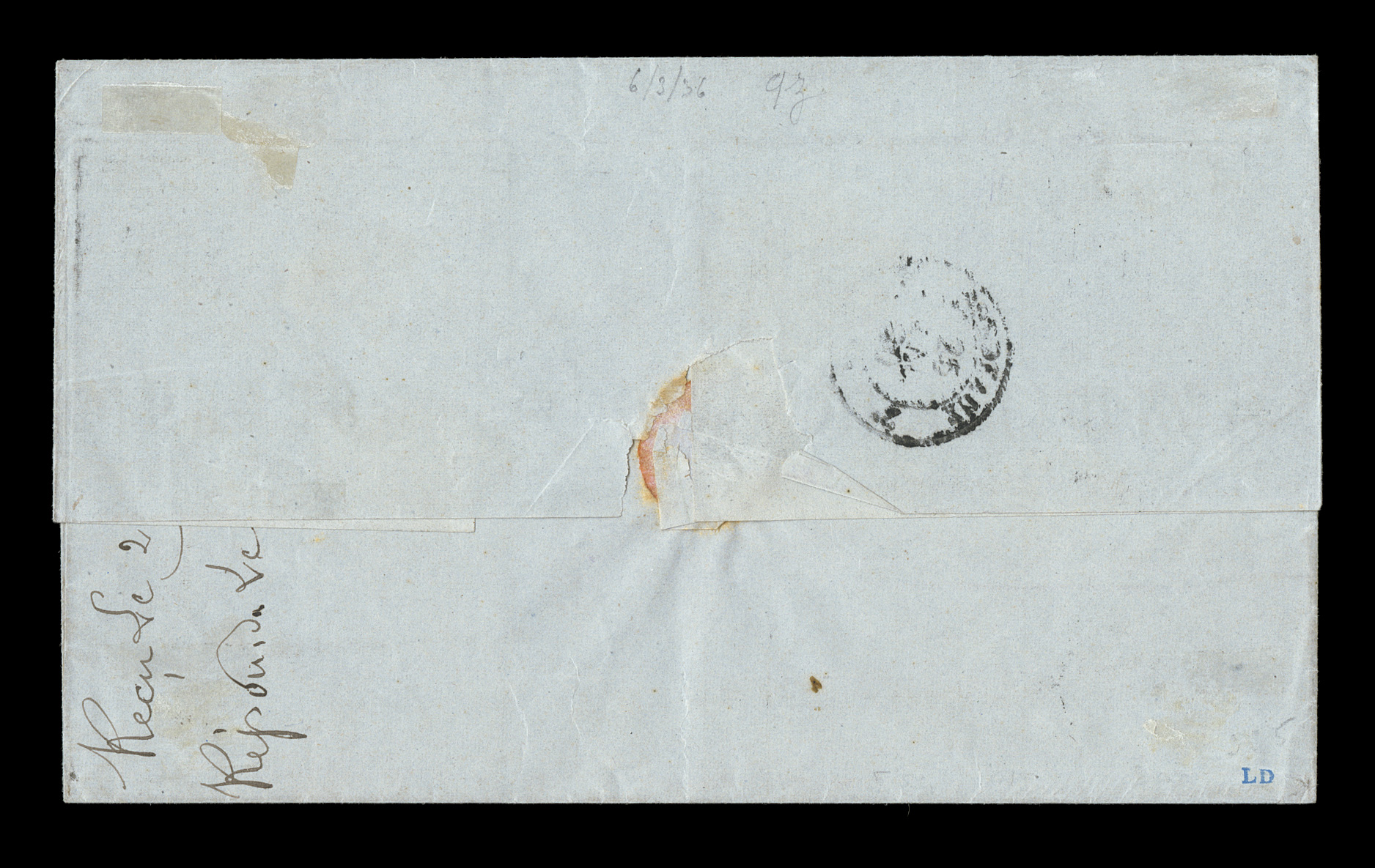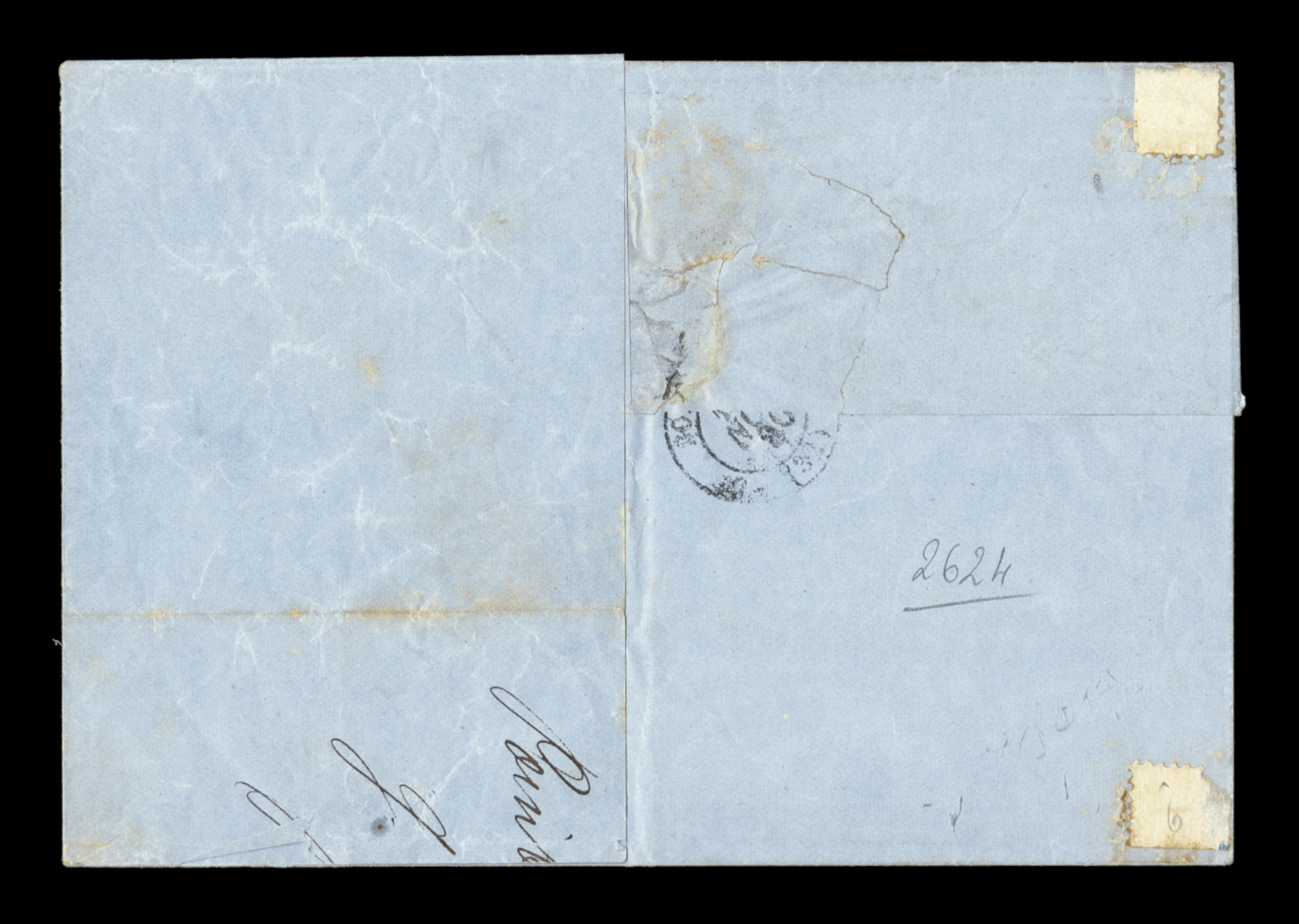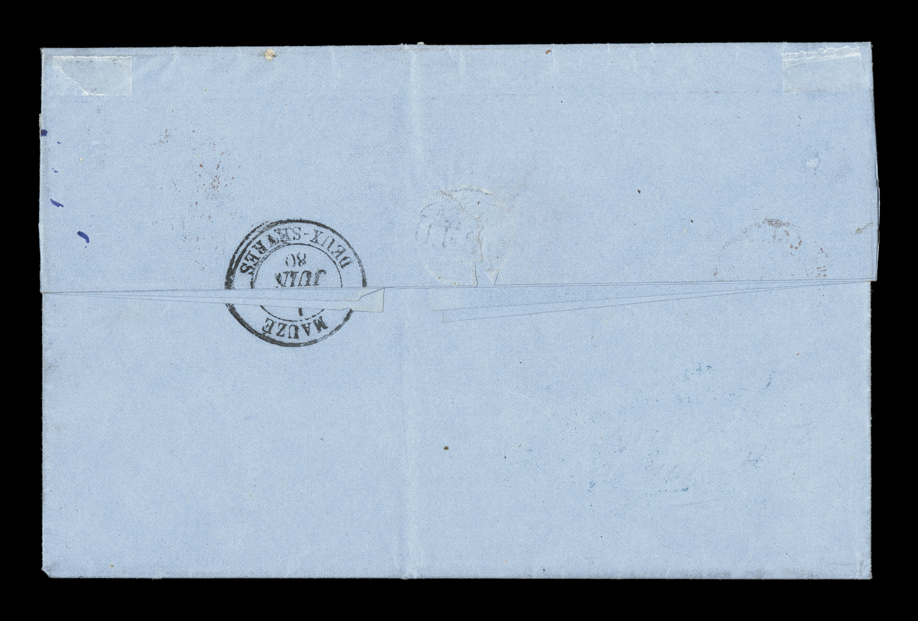 Guade26 Juin 79 double-circle sorting c.d.s. with an additional strikFrench Colonies Yvert #23a, 1872 25c Blue, Ty. III, attractive single with clear to large margins all around, tied to 1879 folded cover to France by "Paq. Ang./Pointe-a-Pitre Guade/26 Juin 79" double-circle sorting c.d.s. with an additional strike at left, carried by British packet with red Calais entry transit, backstamped Bordeaux, trace of tone spots to cover of no consequence, very fine; an early example of the 25c U.P.U. rate by British packet that went into effect on February 16, 1879 and thereafter. (imagea) (Image) Est. $150-200