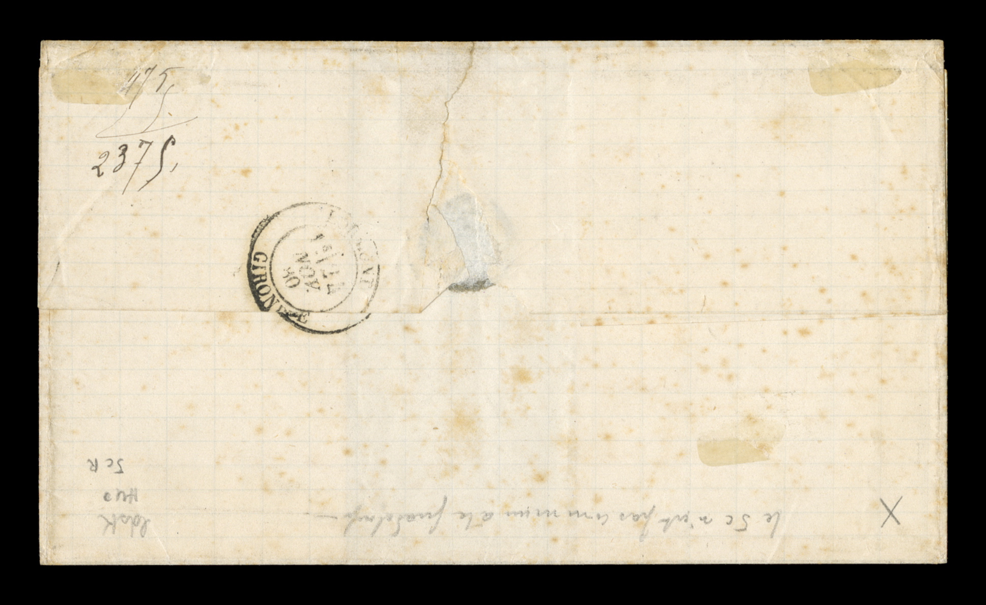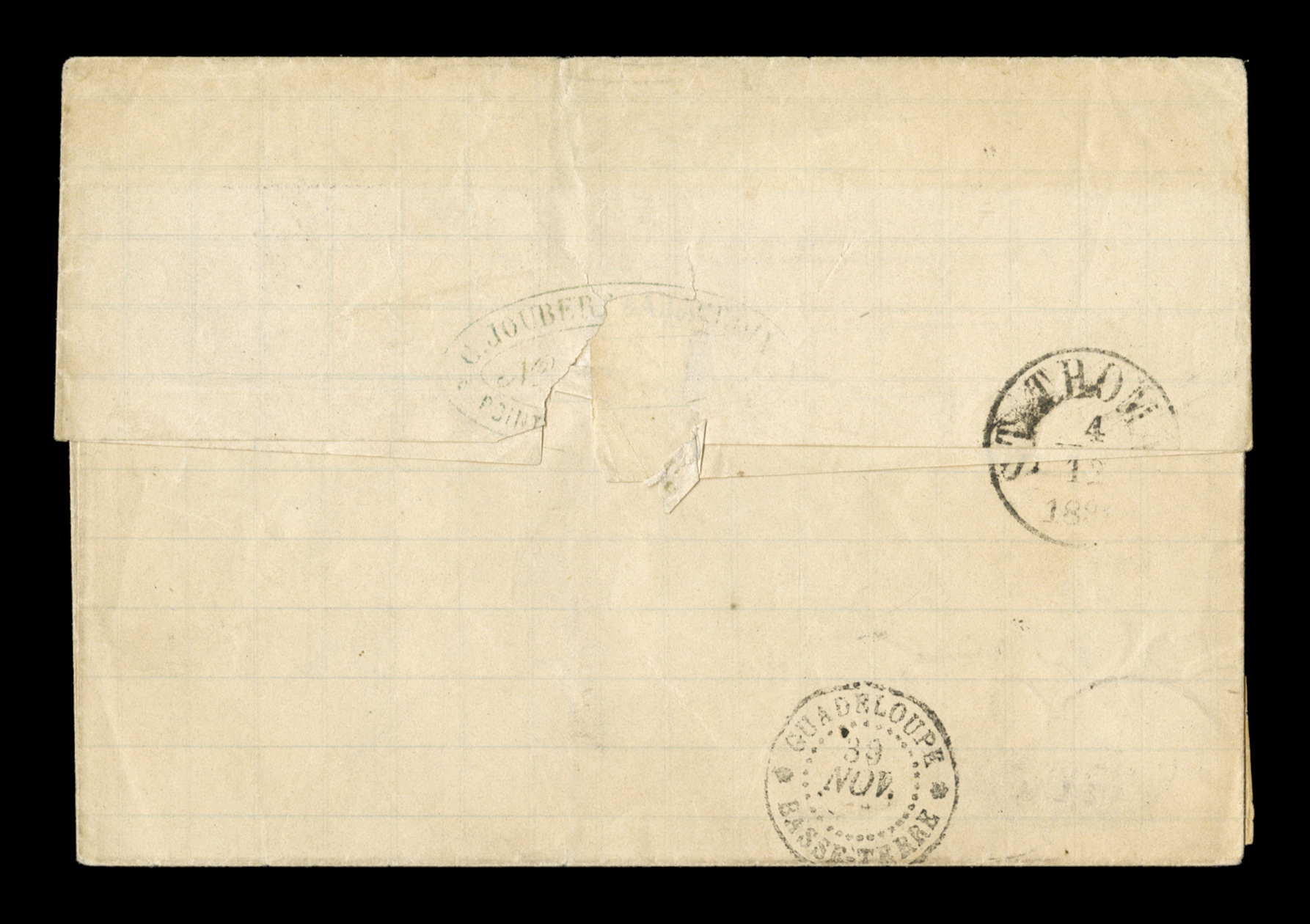 letter to France by black GuadeloupeBasse Terre20 Nov. 81 double-ciFrench Colonies Yvert #44, 1880 25c Bister Yellow, Ty. II, premium single with extraordinarily large margins all around paying the 25c U.P.U. rate, tied to 1881 entire folded letter to France by black "Guadeloupe/Basse Terre/20 Nov. 81" double-circle c.d.s. with additional strike at left, backstamped Bordeaux, very fine; signed H. Bloch. (imagea) (Image) Est. $150-200