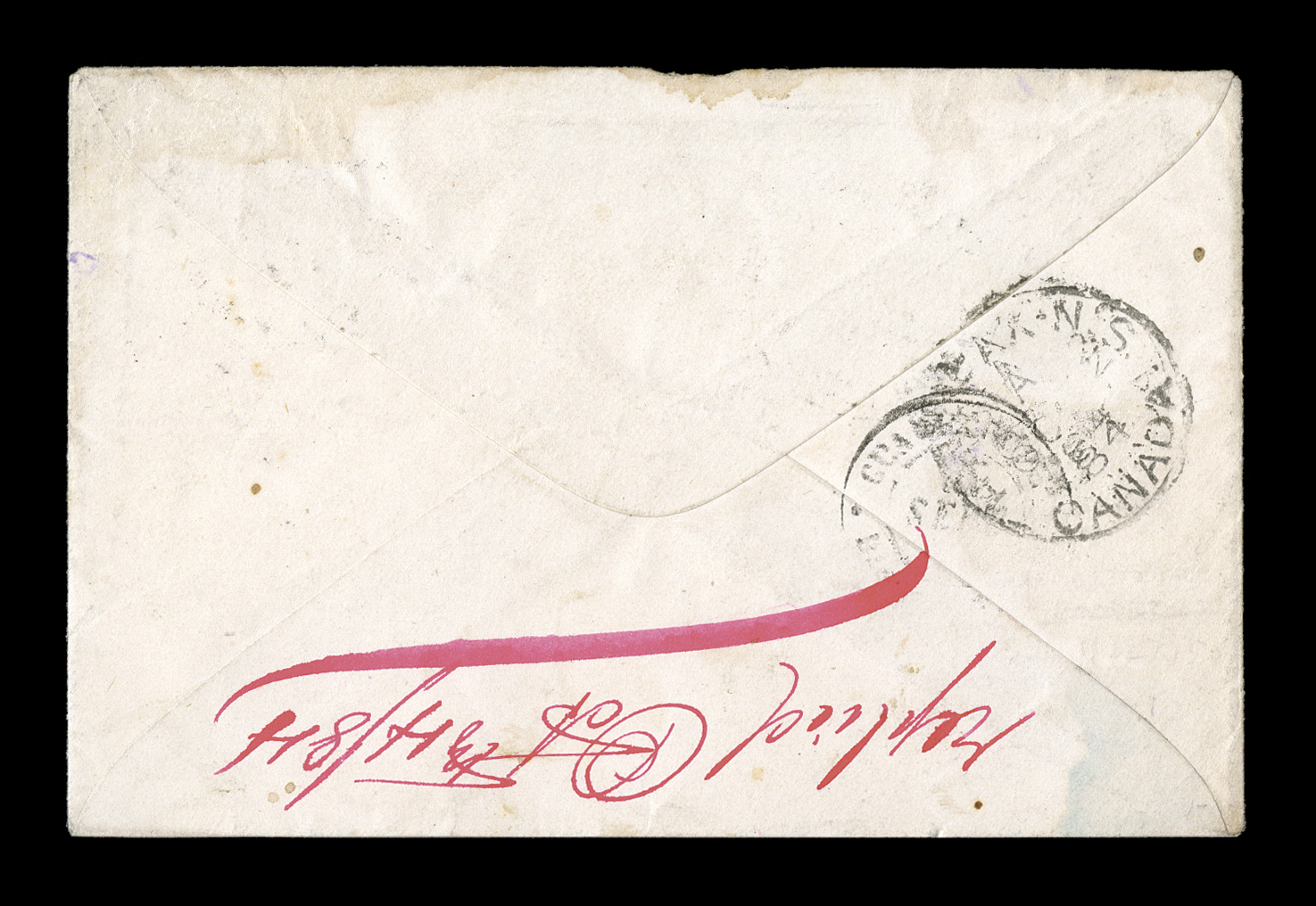 well struck Paq. Ang.Pointe-a-Pitre Guade10 Fevr. 79 double-cFrench Colonies Yvert #21, 1873 80c Rose horizontal pair, mostly clear to large margins, just touched at a couple points, tied to 1879 entire folded letter to New Brunswick, by well struck "Paq. Ang./Pointe-a-Pitre Guade/10 Fevr. 79" double-circle sorting c.d.s. with an additional strike at left, Basse Terre and Halifax transits on the reverse and backstamped Sackville, letter is fresh and intact and probably had an enclosure, couple of small stains to the pair from gum inclusions, still very fine and attractive; an extremely rare usage paying a double non-U.P.U. rate of 80c to New Brunswick; this is one of the very few rates that the 80c values applied to, lasting for a very short period; a pair paying the proper double-rate is an extraordinarily rare usage of this value. (imagea) (Image) Est. $750-1,000