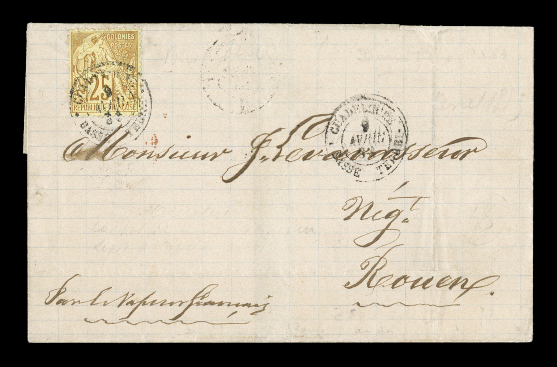 GuadeloupeBasse Terre9 Aout 81 double-circle c.d.s. with additional sFrench Colonies Yvert #44, 1880 25c Bister Yellow, Ty. II, well margined and bright single franking paying the 25c U.P.U. rate, tied to 1881 folded cover to France by black "Guadeloupe/Basse Terre/9 Aout 81" double-circle c.d.s. with additional strike at right, carried by French packet with black Line "A" octagonal entry transit, Paris transit, backstamped Roen, very fine. (imagea) (Image) Est. $150-200