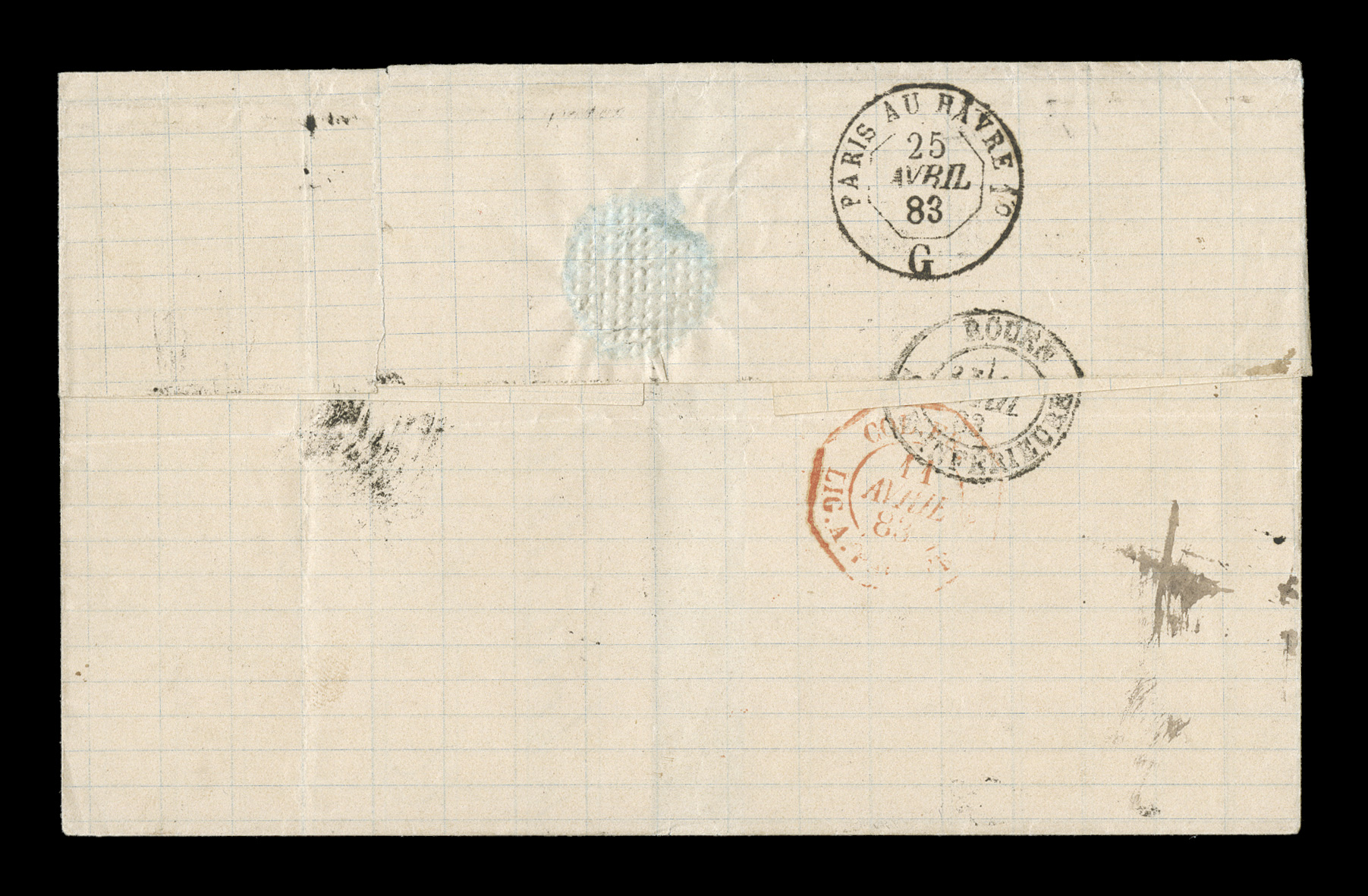 Guade10 Mai 79 double-circle sorting c.d.s. with an additional strikeFrench Colonies Yvert #23a, 1872 25c Blue, Ty. III, choice single with large even margins all around, tied to 1879 entire folded letter to France by "Paq. Fr./Pointe-a-Pitre Guade/10 Mai 79" double-circle sorting c.d.s. with an additional strike at right, carried by French packet with red octagonal packet transit of Line "A", backstamped Bordeaux, fresh and attractive, choice very fine; an early example of the 25c U.P.U. rate by French packet that went into effect on February 16, 1879 and thereafter. (imagea) (Image) Est. $150-200