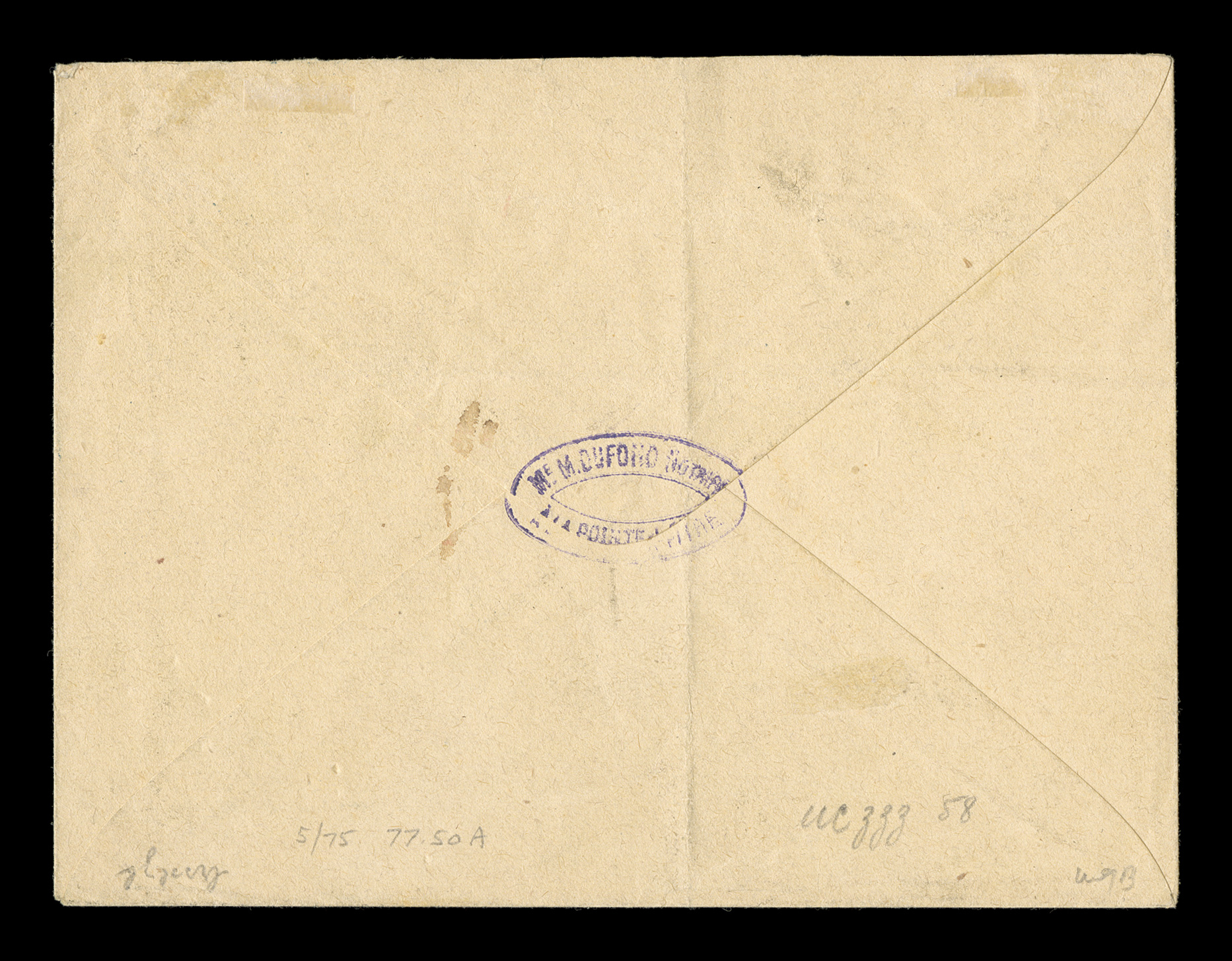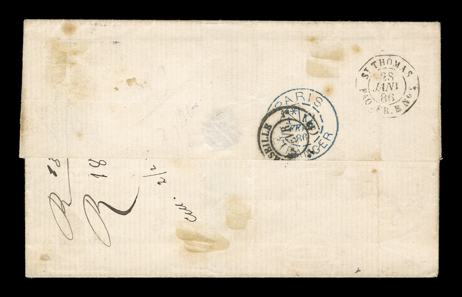 at left, carried by French packet and receiving on the reverseFrench Colonies Yvert #53, 1881 25c Bister yellow, single franking paying the 25c U.P.U. rate to France, tied by "Guadeloupe/Pointe-a-Pitre/24 Janv. 86" c.d.s. with additional strike at left, carried by French packet and receiving on the reverse a rare "St. Thomas/Paq. Fr. B No 1" octagonal black transit (Salles #1444), also on the reverse is a blue Paris entry transit, backstamped Marseilles, very fine and a scarce maritime cover. (imagea) (Image) Est. $150-200