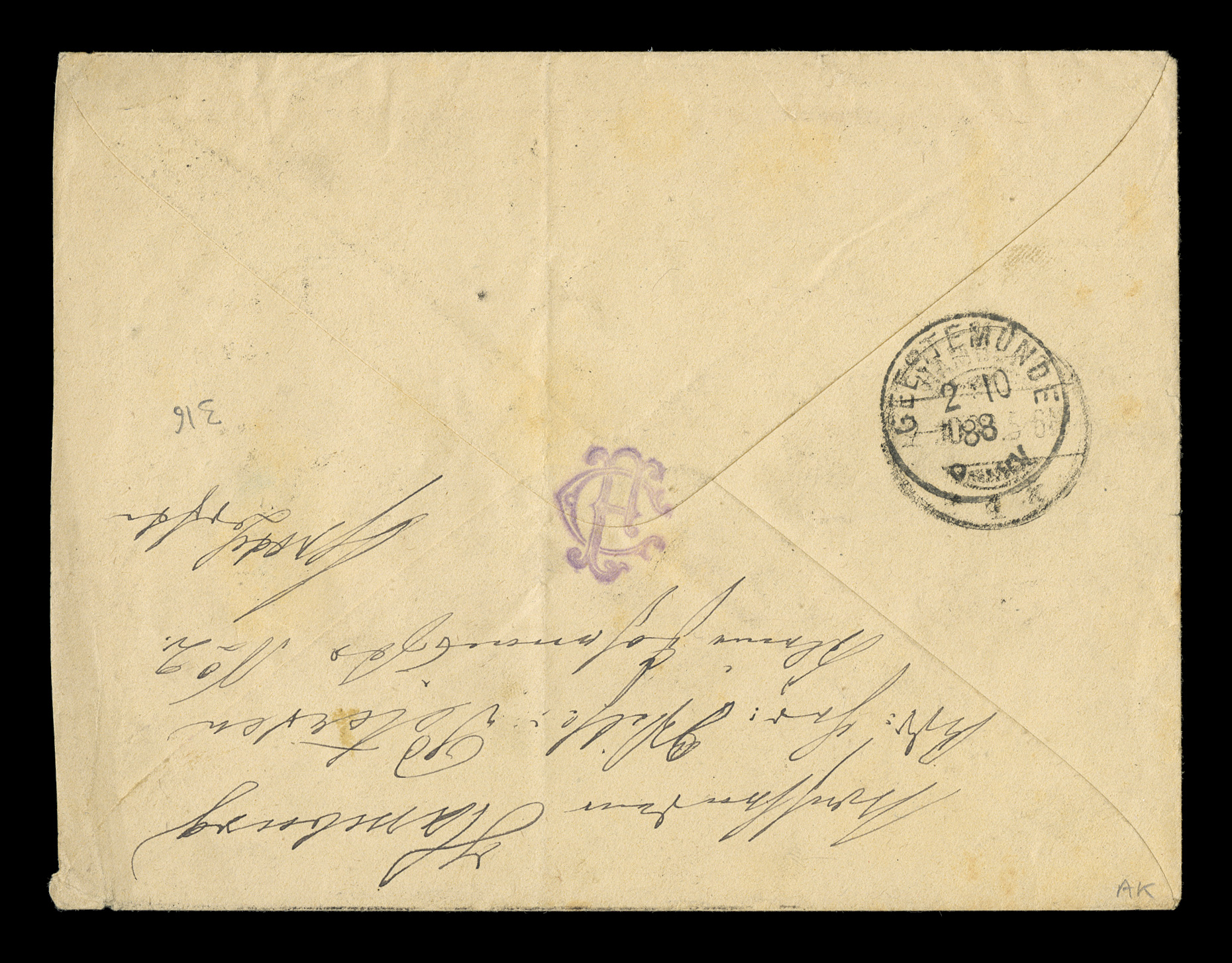 1888 cover to Germany by Basse TerreGuadeloupe14 Sept 88 c.d.s.,French Colonies Yvert #46, 48, 1881 1c Black on blue and 4c Lilac Brown on gray strip of five and single, an unusual and impressive franking making the 25c U.P.U. rate, tied to 1888 cover to Germany by "Basse Terre/Guadeloupe/14 Sept 88" c.d.s., backstamped Geestemunde and forwarded to Hamburg, minor perf toning to the strip, very fine and a rare usage and franking. (imagea) (Image) Est. $500-750