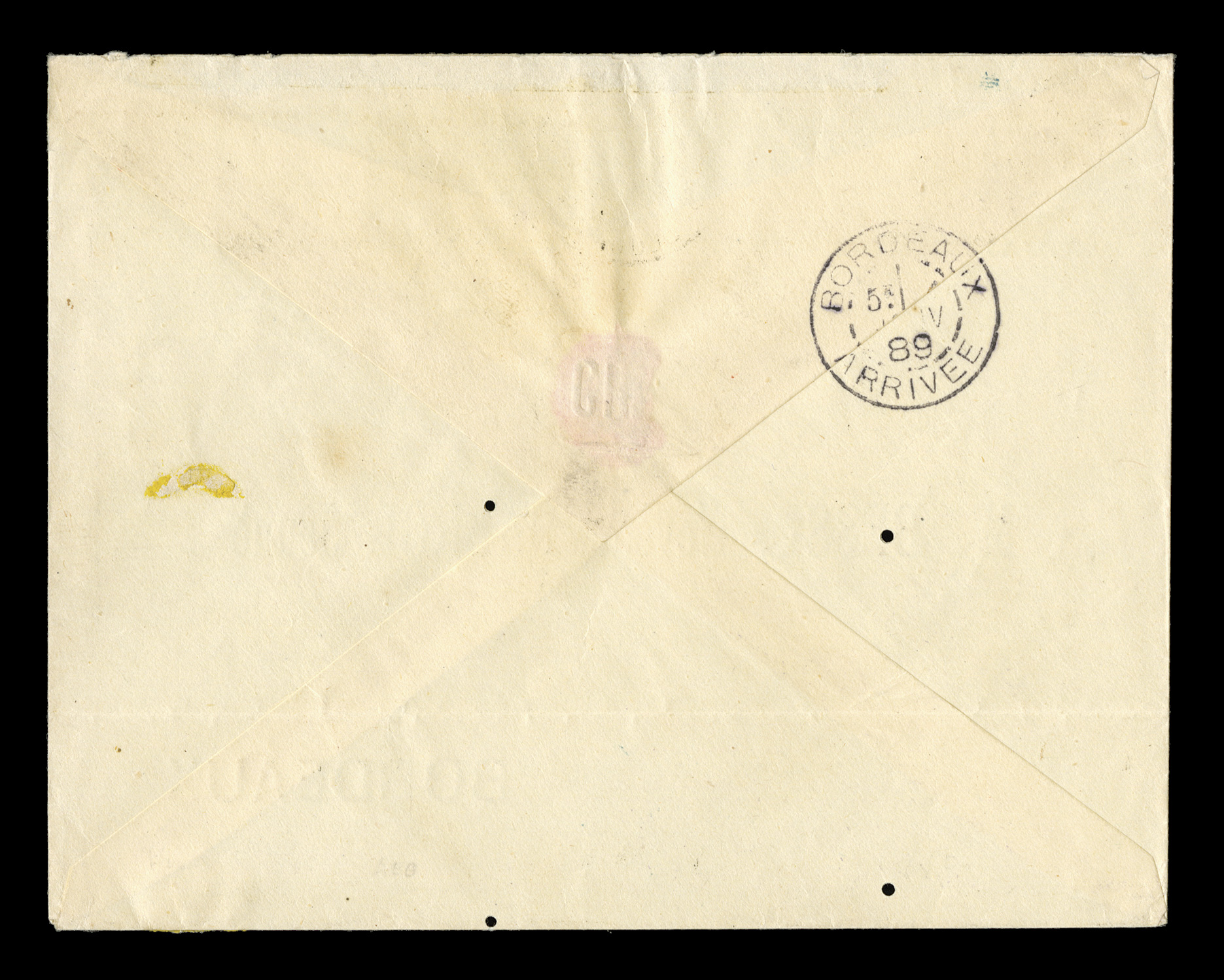 France by Pointe-a-PitreGuadeloupe2 Janv 89 small double-circleFrance Yvert #97, 1886 25c Black on rose, Ty. II, a most unusual franking of the French perforated Sage issue used in Guadeloupe, two singles tied to an 1889 double-rate cover to France by "Pointe-a-Pitre/Guadeloupe/2 Janv 89" small double-circle c.d.s. with an additional strike at left, clear blue octagonal French packet transit of Line "D", backstamped Bordeaux, minor cover flaws at bottom including tiny punch holes not detracting, otherwise very fine; this franking is highly unusual and very rare as stamps of France should not have been accepted used from the colonies at this period, yet this franking was accepted and paying the scarce double rate besides; it is quite likely that the similarity in format and color combination to the French Colonies General issue 25c Black on rose Dubois issue (Yvert #54) may have caused the discrepancy to be overlooked; an extremely rare usage which may be the only recorded example; a single franking cover of the 25c Black on rose Dubois issue from Pointe-a-Pitre included for comparison. (imagea) (imageb) (imagec) (Image) Est. $400-500