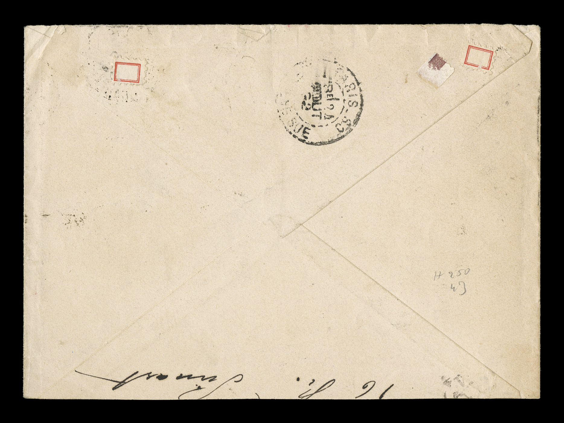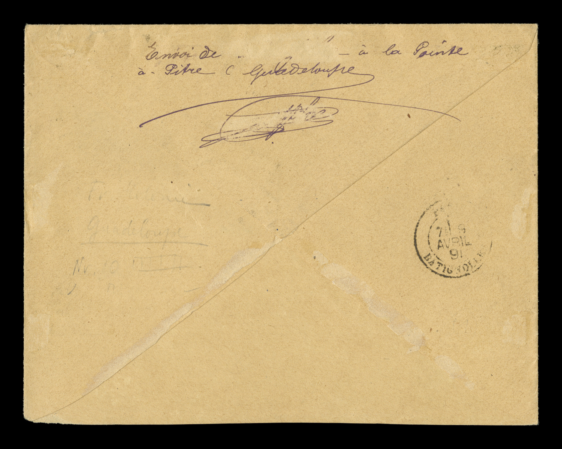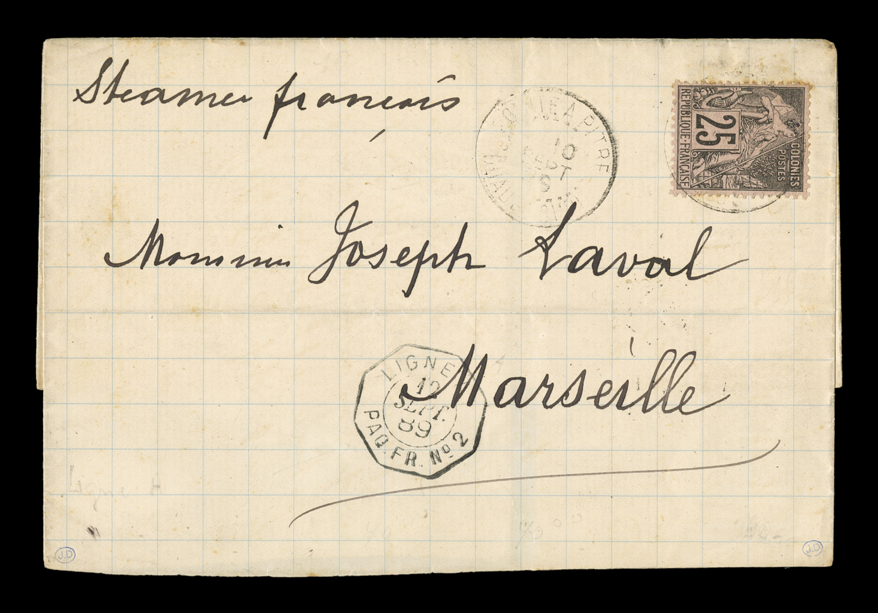 c.d.s. with additional strike at left, clear BM in oval handstamYvert #21, 1891 25c Black on rose with provisional "Guadeloupe" overprint, attractive single tied to 1892 entire folded letter to France by "Pointe a Pitre/Guadeloupe/10 Sept. 92" c.d.s. with additional strike at left, clear "BM" in oval handstamp indicating this was picked up on the mobile postal wagon traveling into Pointe-a-Pitre, French packet octagonal c.d.s. of Line "A", backstamped Nantes, trivial edge tears at top from opening, very fine; a rare example of the postal wagon on Guadeloupe. (imagea) (Image) Est. $150-200
