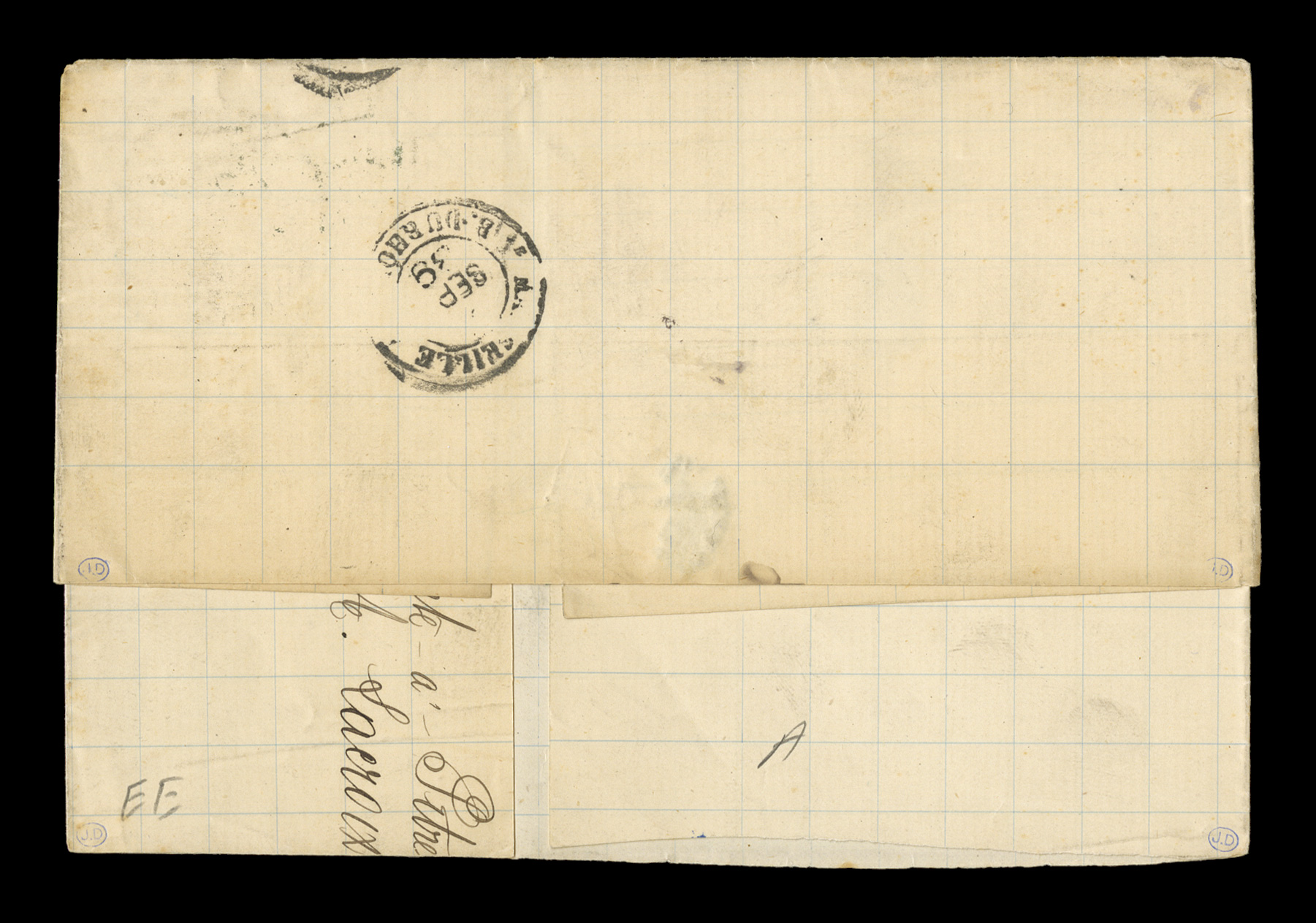 sent by the military concessionary rate to France by black lozenFrench Colonies Yvert #3, 1859 10c Yellow bister horizontal pair, a marvelously choice pair with large and well balance margins all around, tied to beautiful 1864 small envelope sent by the military concessionary rate to France by black lozenge cancels, well struck "Basse-Terre/Guadeloupe/24 Oct 1864" rimless c.d.s. below, plus the very rare blue "Corr. D. Armees/Basse-Terre/24 Oct. 64" octagonal c.d.s. at top left, via French packet per ms. endorsement, red boxed "PD" handstamp and endorsed by a battalion commander, backstamped Paris, extremely fine; an early use of this incredibly rare Basse Terre military postmark paying the 20c military rate rather than the 50c French packet rate at this period; in addition possessing fabulous freshness with all of the markings being beautifully struck; believed to be one of the finest 20c military concessionary rate covers recorded; ex-Dubus. (imagea) (Image) Est. $5,000-7,500