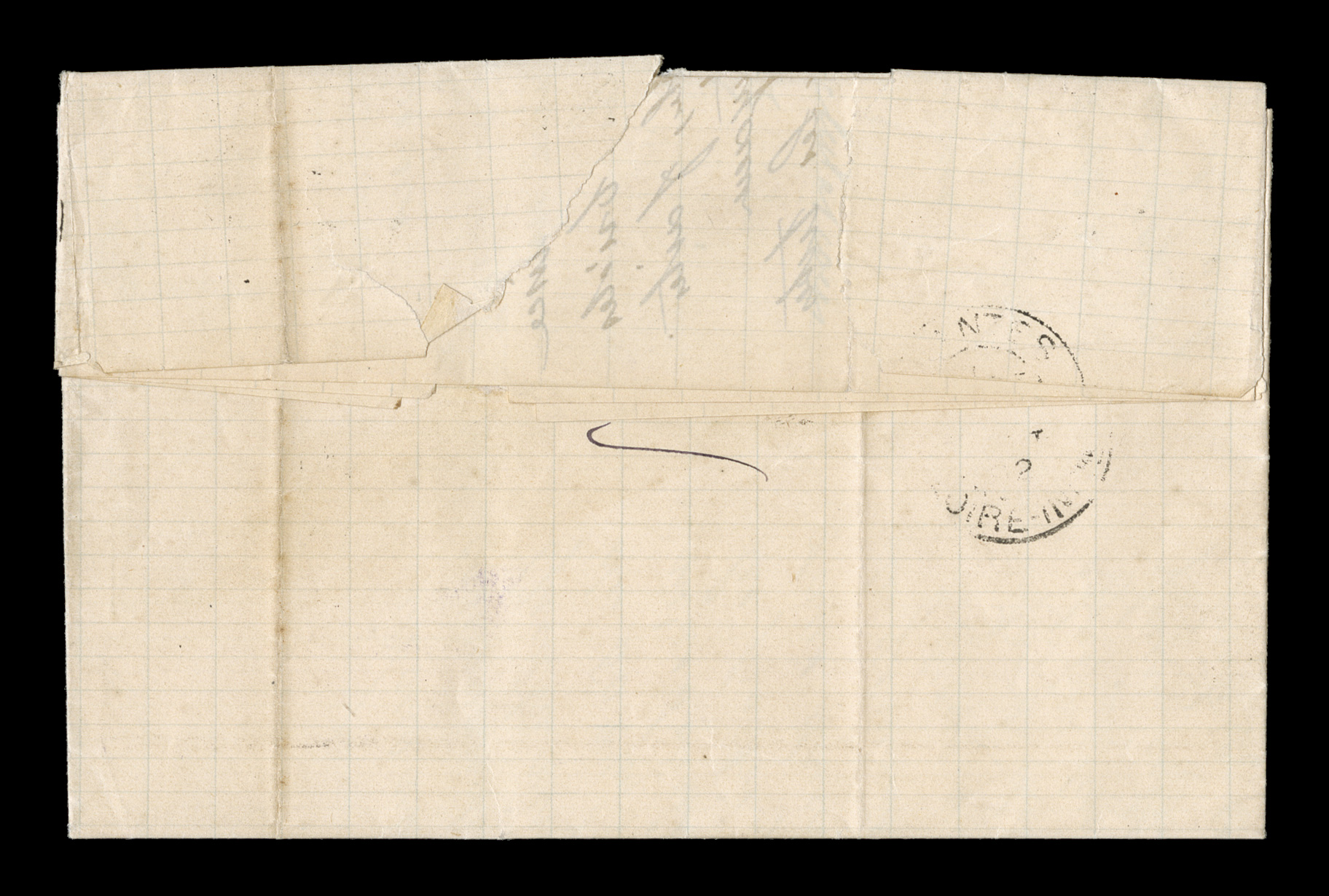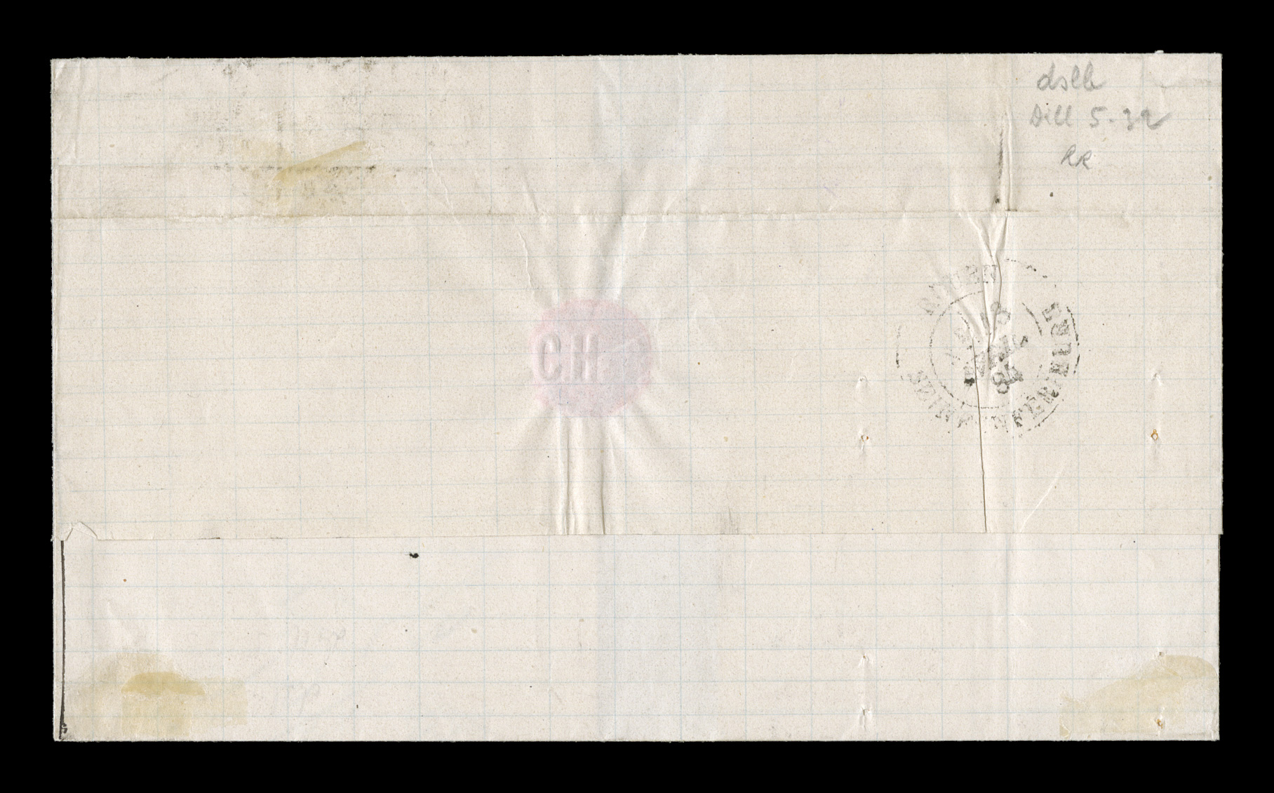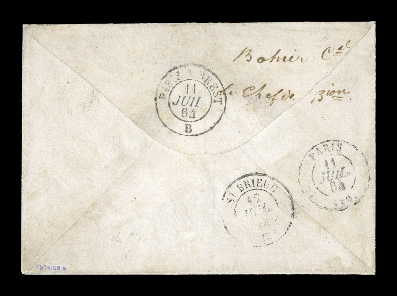 Basse-TerreGuadeloupe24 Juin 1864 rimless c.d.s. on attractive small enve1864 Basse Terre unpaid military cover, to France, carried by French packet as indicated by the ms. routing instruction through St. Nazaire, unusual and scarce blue "Basse-Terre/Guadeloupe/24 Juin 1864" rimless c.d.s. on attractive small envelope with matching blue "Corr. D. Armees/Basse-Terre/24 Juin 64" octagonal military c.d.s., plus a rather crude locally made "30" double-line handstamp for the 30c unpaid concessionary rate for military correspondence, endorsed by a battalion commander on the reverse, two transits on the reverse and backstamped St. Brieuc, choice very fine; the unpaid military rate was 50% more than the paid rate but still substantially less than the 50c normal packet rate; a rare and seldom seen cover. (imagea) (Image) Est. $750-1,000