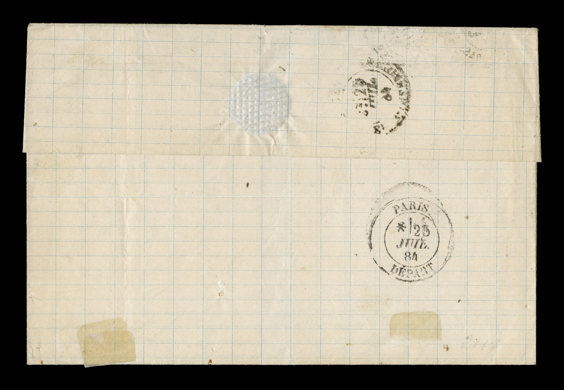 three positions of the double-pane overprint setting of 50, mostlYvert #2b, 1884 "G.P.E./25" Provisional surcharge on 35c Violet black on orange, large "5" in "25", position 13R, an attractive example of this scarce variety that is found in only three positions of the double-pane overprint setting of 50, mostly clear to large margins all around just touching at one point, tied to folded cover to France by "Guadeloupe/Pointe-a-Pitre/26 Mars 84" c.d.s. with additional strike at left, marked per British packet, backstamped Rouen, very fine; a rare use of this overprint variety shortly after issuance; signed Roumet, Dillemann. (imagea) (Image) Est. $500-750