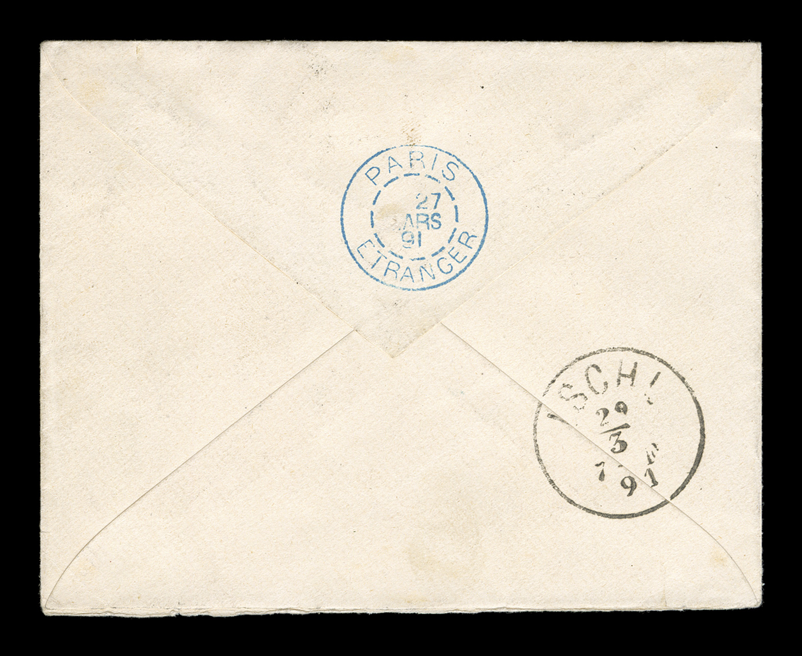 149 c Yvert #11 Yvert 11, 1891 5cGPE Provisional surcharge on 1Fr Olive horizontal pair, in mixed franking with French Colonies 15c Blue (Yvert 51), tied to handsome 1891 cover to Austria by