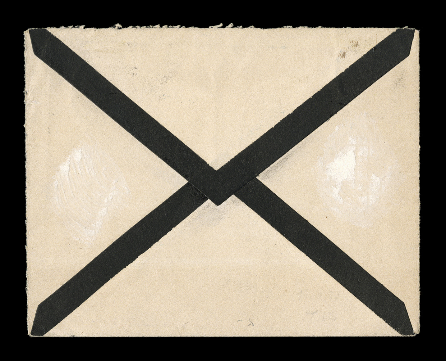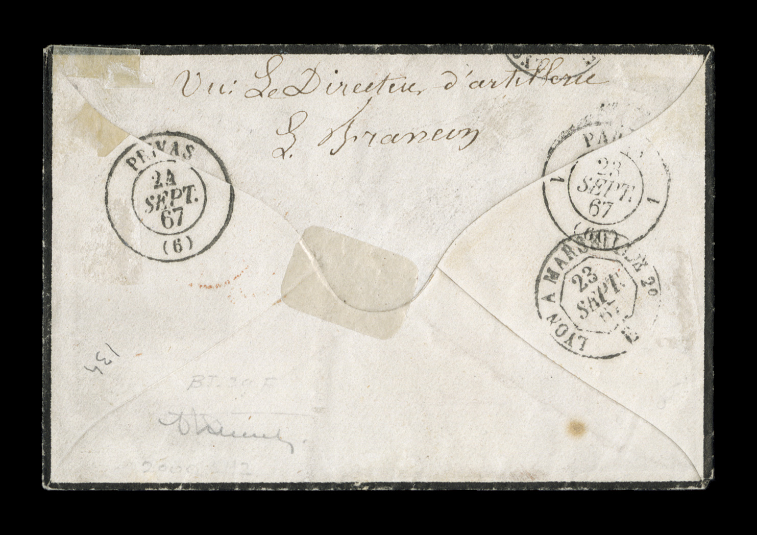 neat 7x7 point black lozenge cancel, small black GuadeloupeBasse-TerrFrench Colonies Yvert #4, 1865 20c Blue, attractive four-margin example in a single franking paying the 20c military concessionary rate, tied to petite 1867 mourning cover by neat 7x7 point black lozenge cancel, small black "Guadeloupe/Basse-Terre/29 Aout 67" double-circle c.d.s. at left with a nice strike of the very rare blue "Corr. D. Armees/Basse-Terre/29 Aout. 67" octagonal military postmark, carried via French packet with red St. Nazaire entry transit, red boxed "PD" handstamp and endorsed by an artillery commander on the reverse, various transits on the reverse and backstamped Privas, very fine and exceptionally choice; a colorful and exceptionally attractive cover paying the 20c military rather than normal 50c French packet rate; ex-Levett. (imagea) (Image) Est. $1,500-2,000