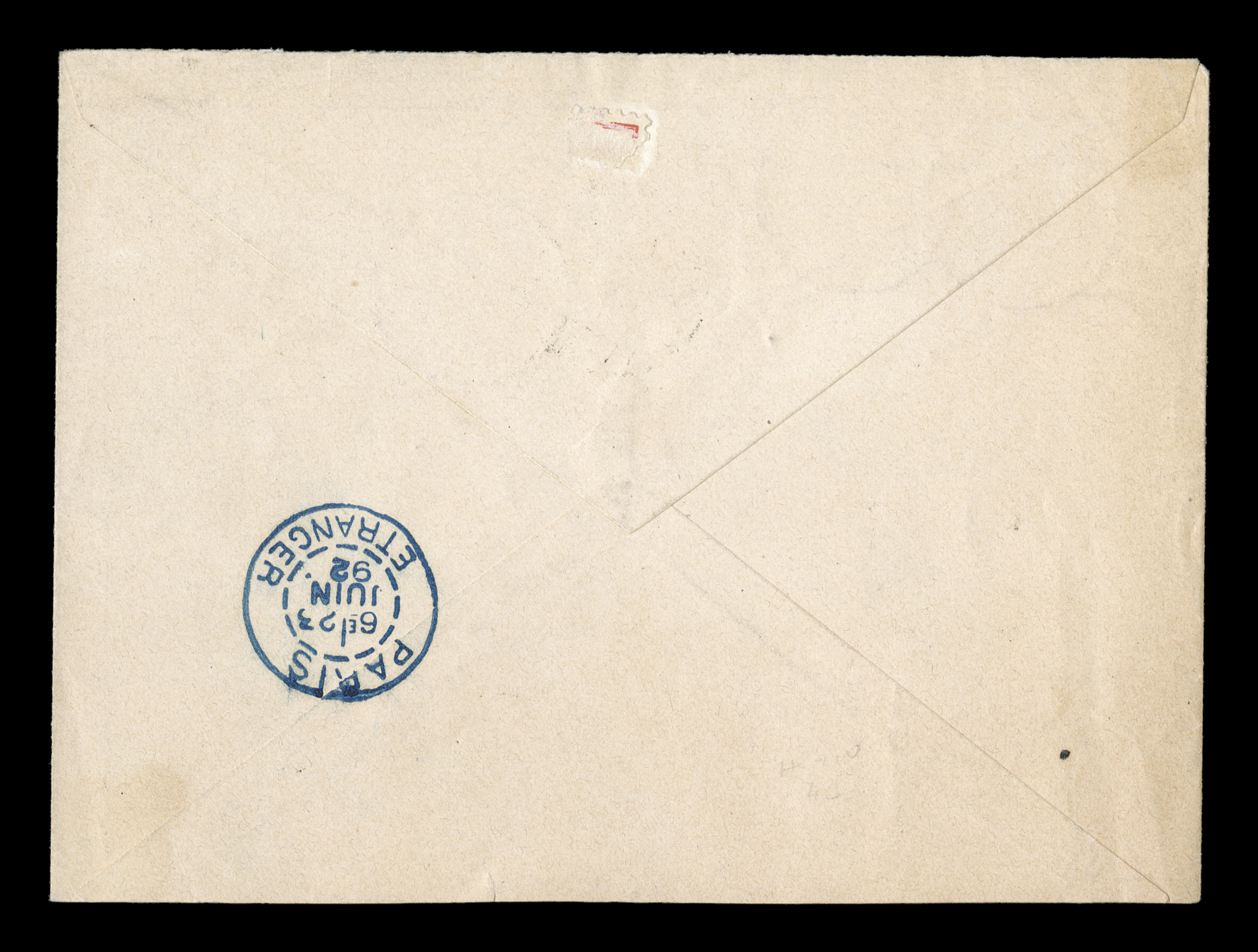 Basse-TerreGuadeloupe11Juin 92 c.d.s. with additional strike atYvert #18, 19, 1891 10c Black on lilac and 15c Blue with provisional "Guadeloupe" overprints, attractive deep colors with typical centering, tied to fresh 1892 cover to France by "Basse-Terre/Guadeloupe/11Juin 92" c.d.s. with additional strike at right, backstamped Paris, very fine and attractive cover showing the 25c U.P.U. foreign mail rate. (imagea) (Image) Est. $150-200