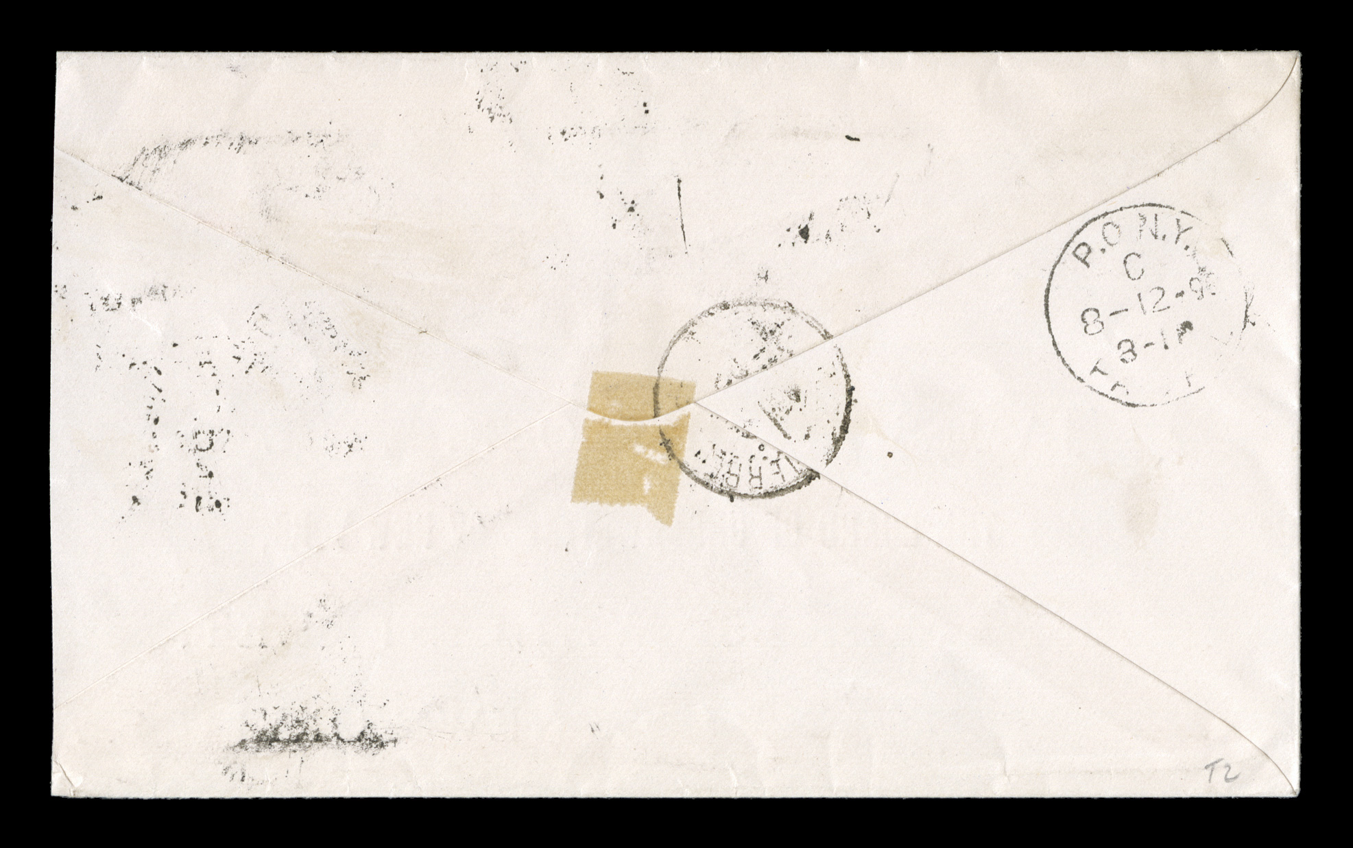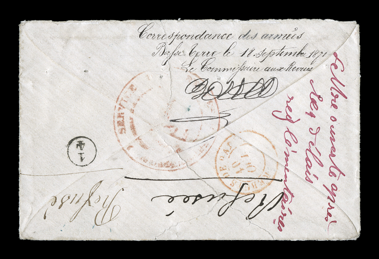beautifully struck with the stamp tied by clear 8x8 point black lozenFrench Colonies Yvert #4, 1865 20c Blue, four well clear to large margins tied to an attractive and especially interesting 1871 military cover, all of the many markings are beautifully struck with the stamp tied by clear 8x8 point black lozenge cancel, very rare small black "Paq. Fr./Basse-Terre Guadele/19 Sept. 71" double-circle sorting c.d.s. for transport by French packet, rare black "Corr. D. Arm/Basse-Terre/19 Sept. 71" octagonal military c.d.s., blue St. Nazaire entry transit, proper military endorsement on the reverse, backstamped Paris, closed tears to the back that do not detract, very fine; this cover was found to be overweight and marked with ms. "2" indicating that it required two times the postage, it was then treated as an unpaid cover at the amount of 60c with credit given for the 20c stamp and marked "4" decimes handstamp due, this cover was being sent to a military office in Paris that evidently didn't want to pay the postage due so it was refused and turned over to the Rebuts office in Paris with red c.d.s. on the reverse for processing the return to the sender; the military usage is extremely rare in itself but the postage due and the refusal by the recipient make this an incredible rarity, quite possibly the only recorded colonial military cover processed through the Rebuts office. (imagea) (Image) Est. $3,000-4,000