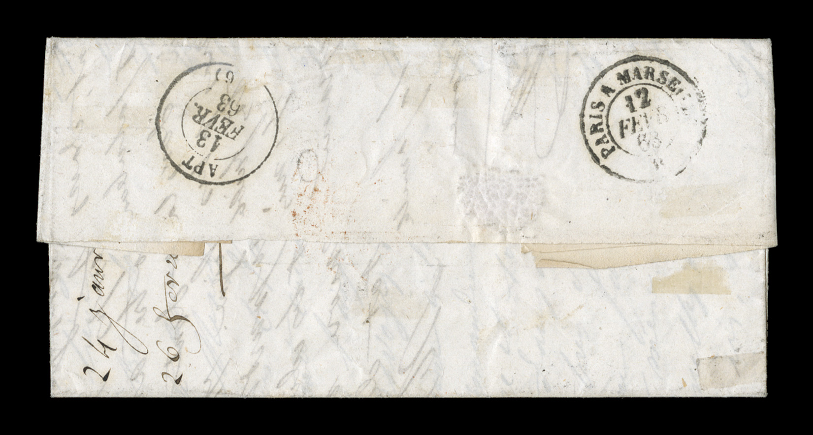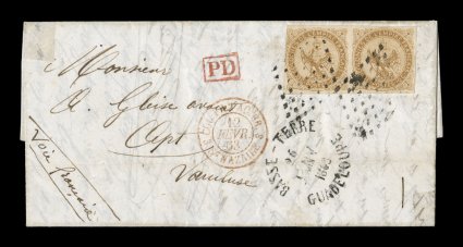 military letter to France by clear 7x7 point black lozenge cancFrench Colonies Yvert #3, 1859 10c Yellow bister horizontal pair, a handsome pair with well clear to large margins all around, stamps are neatly tied to petite 1863 entire folded military letter to France by clear 7x7 point black lozenge cancels, with equally well struck "Basse-Terre/Guadeloupe/26 Janv 1863" rimless c.d.s. below, via French packet with attractive red St. Nazaire entry transit and red boxed "PD" handstamp, Paris-Marseilles railroad transit, backstamped Apt, very fine; this very early military cover was sent prior to the military postmark of Basse Terre being issued in 1864; the only way that the military usage can be determined at this early time is by the post office's acceptance of the 20c military concessionary franking rather than the 50c normal rate that applied to both British and French packets at this period; attractive and exceptionally rare example of the military rate before the creation of military postmarks from Guadeloupe. (imagea) (Image) Est. $2,000-3,000