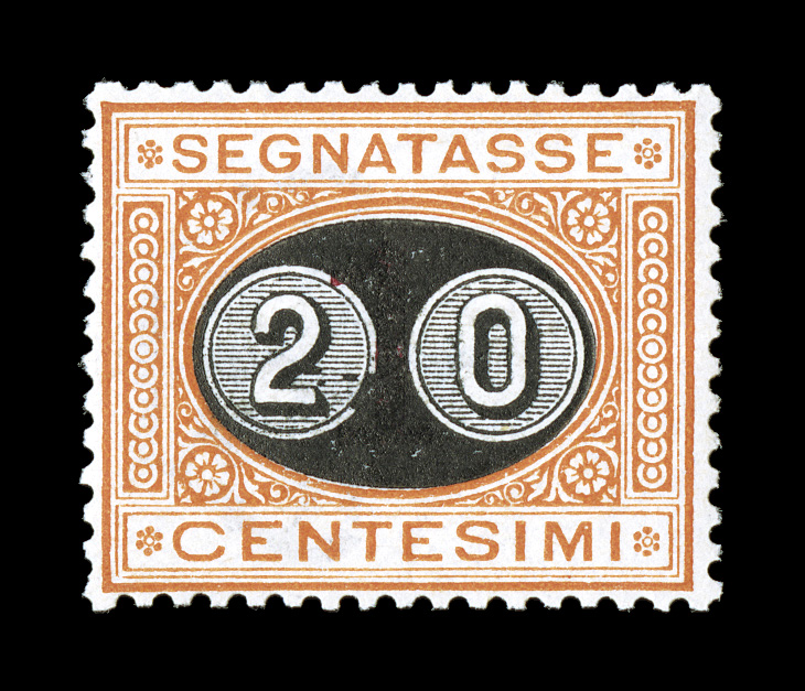 o.g., h.r., extremely fine Sassone catalog value is for excellentSassone S#18, 1890 20c on 1c Ocher and carmine, an amazingly well centered mint single, a feature that is totally out of character for this early postage due, strong rich colors, o.g., h.r., extremely fine; Sassone catalog value is for excellent centering (Scott #J26; $275.00). (Image) €1,625