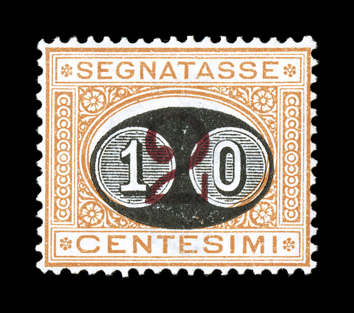 attractive with gorgeous rich colors on paper that is bright white andSassone S#14b, 1870 10L Blue and brown, inverted numeral, an incomparably rare unused example of the inverted numeral error of the Ten Lira 1870 Postage Due issue, especially attractive with gorgeous rich colors on paper that is bright white and fresh, the back is as clean as the front, without gum as all examples of this rarity are, in addition this stamp has attractive fine centering with crisp perforations, a choice example of this rarity.Interestingly the used examples of the 10L high value are the most common of the inverted numerals of the 1870 postage dues. Apparently these were virtually all used as the the unused examples are of the greatest rarity. In addition, this is the only Lira value error of the early postage dues that is known mint or unused.The census of this unused error has been noted through the years. At the time of his 1986 certificate Dr. Enzo Diena noted that there were only two examples recorded. The Sassone Catalog now notes that three examples are known and all of them are without gum. This makes this value, along with three other values of this set, among the rarest of the postage due inverted numerals. All are listed but none of these are priced in Sassone. An astounding inverted center rarity of Italy that only appears on the market at infrequent intervals. This stamp is signed E(nzo) Diena and S. Sorani. In addition it is accompanied by a 1986 certificate of Enzo Diena and a 2000 Silvano Sorani certificate (Scott #J19a; unlisted unused). (Image) Est. $20,000-25,000