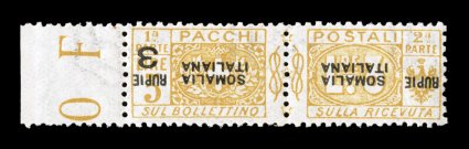never been hinged, normal fine centering as found on virtually aSassone PP#58, 1940 50c Orange with "Somalia/Italiana" overprint, pristine mint example of this parcel post rarity, radiant color on fresh bright white paper, full o.g. that has never been hinged, normal fine centering as found on virtually all of the known examples of this value, a very fine and attractive example of this elusive value; the issuance of this extraordinarily rare value is very low and of all of the parcel post values in the Italian area this is one of the rarest being missing from most collections; signed Raybaudi and accompanied by a 2000 Raybaudi gold certificate (Scott #Q43A; $14,000.00). (Image) €20,000