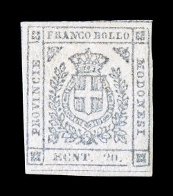 47 ogngO Sassone #1/18, SG2/5 Modena mint and used collection of over 40 singles plus a couple of blocks (Sassone #1/18, SG2/5), mint and used are about equal in number and most have been selected for their attractive appearance, nearly all are with four margins and some have one or more dividing lines showing, most are the normal stamps though we note a couple of varieties including "8" for "80" on the 80c Buff of the Provisional Government issue, also includes some of the newspaper tax stamps including a rather nicely margined 10c Black with horizontal dividing line (#PR5), a few small flaws are present, most are fine-very fine or better; some signed by various experts (Scott #1/14, PR2-5; Scott catalog value in excess of $8,500.00). Est. $750-1,000