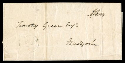 Finance, to raise funds for the fledgling republic and its ill-eqMorris, Robert American patriot and financier (1734-1806); Signer of the Declaration of Independence; called the "financier of the Revolution" for his efforts, as Superintendent of Finance, to raise funds for the fledgling republic and its ill-equipped armies; one of Pennsylvania's first two US Senators; his massive real estate speculations ruined him when the bubble burst, and he died a pauper. Exceptional association Autograph Postal Cover Franked "Robt. Morris" at lower left. Addressed in his hand to "The Hon'ble / John Hancock Esqr. / President of Congress / Baltimore". With the word "Free" written in another hand at upper right. Perhaps this should not have been franked, for Morris has also marked it "private" just above his signature! Matted with 8vo engraved portraits of Morris and Hancock, as well as biographical plaques, and contained under glass in an elaborate gilt wooden frame, overall size 27" x 22.5". Evidence of paper repair at left edge of cover, not affecting writing; folds, overall VG. The Continental Congress's presence in Baltimore allows us to date this cover between mid-December 1776 and late February 1777. In early December, the British had invaded New Jersey after driving George Washington's troops out of Brooklyn and Manhattan, raising fears that Philadelphia would be captured. After Washington's daring raids at Trenton and Princeton, the British crossed back over the Hudson to enter winter quarters, and Congress was able to return to its home in Philadelphia. (Image) Est. $500-750