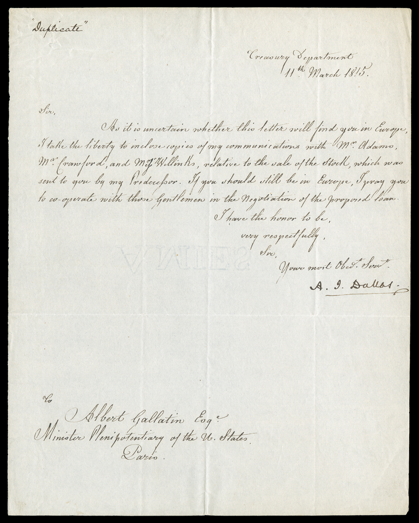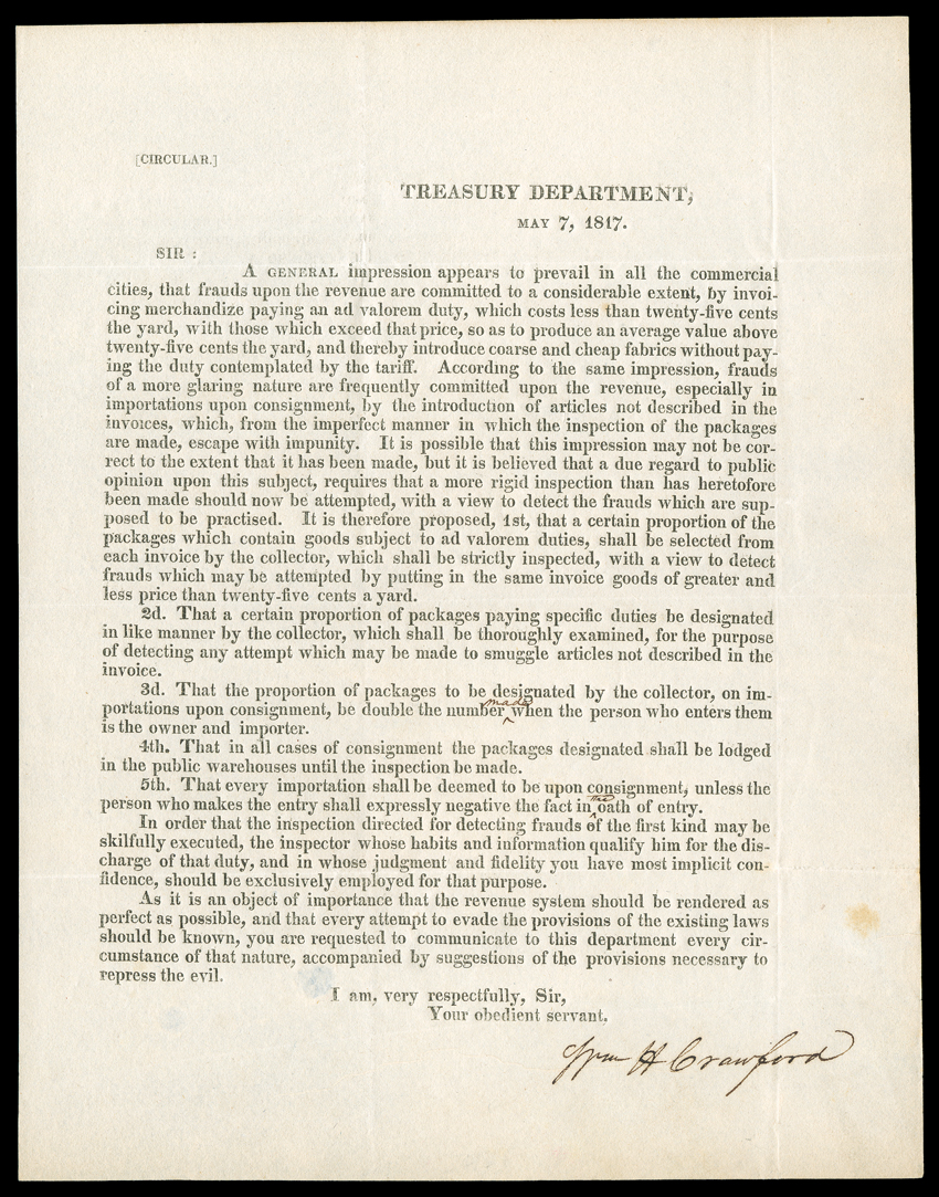 Dexter, 12 page and 23 page, 4to, Washington, July 30, 1800 anSecretaries of the Treasury, 1801-29 [J. Adams - J.Q. Adams] A series of autographs of early Secretaries of the Treasury. Includes: Two Manuscript Letters Signed by "Saml. Dexter," 1/2 page and 2/3 page, 4to, Washington, July 30, 1800 and March 18, 1801. The first, written as Secretary of War, is to Thomas Perkins, sending a list (not present) of "Invalid Pensioners for the State of Massachusetts, with my warrant thereon..." The second letter, which has been inlaid to a slightly larger sheet, is as Secretary of the Treasury, to George Simpson, cashier of the Bank of the United States, with a very interesting request: "The Supervisor for the District of Virginia has Deposited in the Bank of Alexandria Notes of the several offices of Discount and Deposit to the amount of between sixty & seventy thousand...As these notes are refused to be received in payment of the Treasurers draughts, it will operate as an accomodation [sic] to this Department, if you would consent to receive them on deposit..." Archive tape reinforcements on verso of second letter. With good association LS "A.J. Dallas" as Secretary, 1/2 page, 4to, Washington, March 11, 1815. He writes to Albert Gallatin, US Minister Plenipotentiary in Paris, enclosing copies (not present) "of my communications with Mr. [John Quincy] Adams, Mr. [William H.] Crawford...relative to the sale of the Stock, which was sent to you by my Predecessor" [George W. Campbell]. VG. Gallatin, who with Adams had just negotiated the end of the War of 1812, had replaced Crawford as minister. Interestingly, Crawford would be Dallas's own replacement in the Treasury Department. With Signature "A.J. Dallas" clipped from the end of an official letter. With printed circular LS "Wm. H. Crawford," 1 page, 4to, Washington, May 7, 1817. Crawford sets out the rules for closer inspection of imports due to the prevalence of fraud to evade tariffs. With Autograph Postal Cover Franked "Treasury Dept / Wm. H. Crawford" at upper right. Addressed to William Hunter of Newport, RI. With "Free" stamp just below signature. Both VG. Also with LS and ADS "Saml. Meredith" as first US Treasurer, 1/2 page, 4to, and 1 page, narrow oblong 8vo, December 8, 1800 and May 8, 1795. The letter encloses $16,000 from the US Treasury to Jabez Bowen, Chief Justice of Rhode Island. The document is a payment from the Treasury to an undeciphered recipient in the amount of $30. Both are Good. (imagea) (imageb) (Image) Est. $500-750