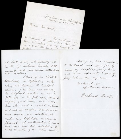 administration US Minister to France helped establish the SmithsRush, Richard US Secretary of the Treasury under J.Q. Adams and US Attorney General under Madison and Monroe (1780-1859); acted as Secretary of State in the early days of Monroe's administration; US Minister to France; helped establish the Smithsonian Institution. Good content Autograph Letter Signed "Richard Rush," 2-1/2 pages, 8vo, Philadelphia, November 26, 1850. He sends his first cousin Mrs. Roach a letter from his late father, Signer of the Declaration of Independence Benjamin Rush (not present), assuring her that she has "not passed from my thoughts since we met at Rhineland." He thinks she will find the letter especially of interest "because of its ancient date, and because written to your aunt - my mother." Some fingerprints at top of first page, otherwise VG. (Image) Est. $300-400
