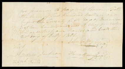 daring military commander, his stunning victory at New Orleans in JanJackson, Andrew Seventh President of the United States (1767-1845, served 1829-37); an early leader in the West, becoming one of Tennessee's first US Senators upon statehood; a daring military commander, his stunning victory at New Orleans in January 1815 made him a national hero; the first president who was called to office as the people's choice, he was also the last to have served in the Revolutionary War. Scarce early Autograph Document Signed "Andrew Jackson" while Justice of the Tennessee Supreme Court, 1 page, oblong 8vo, no place, July 24, 1801. He writes out and witnesses a promissory note on behalf of John Caffery and Thomas Harney, who promise "to pay unto Bowling Felts the Sum of Two Hundred Dollars on or before the Twenty fifth day of December Eighteen hundred and two it being for value received..." Embossed at left with second-issue 25-cent revenue stamp (RM-263) with a good impression of an American eagle holding a shield. Tipped gently to a slightly larger black sheet but easily removed. Fold wear including tiny hole at fold intersection, some spots of toning, otherwise VG. John Caffery was Jackson's brother-in-law, married to the sister of his wife, Rachel Donelson Jackson. Jackson treated his wife's family fully as his own, and would later help Caffery when the latter's farm was to be lost due to a debt. (Image) Est. $1,000-1,500