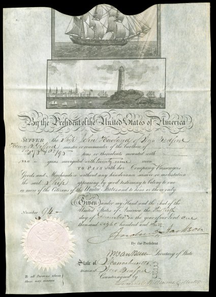 Buren, the New York political whiz when he chose him as his Secretary ofJackson, Andrew, and Martin Van Buren Seventh and eighth Presidents of the United States; Jackson, the man of the people who arose in the West, was well complemented by Van Buren, the New York political whiz when he chose him as his Secretary of State; ultimately Van Buren would become Jackson's Vice President and his successor. Choice partly engraved Document Signed "Andrew Jackson" as President and "M. Van Buren" as Secretary of state, 1 page, folio, on vellum, [Washington], December 30, 1830. A ship's passport for "the Ship John Howland of New Bedford [Massachusetts] Henry B. Gifford, master or commander of the burthen of 376 & 82/95 tons or thereabouts, mounted with no guns, navigated with twenty nine men..." Seal of the United States at lower left. Also signed by Lemuel Williams, Collector of New Bedford, with docket and certifications of the ship's later masters on verso. Folds, toned, otherwise VG. The distinctive scalloped top of this document was cut so that it could be matched with the top portion, which was retained by the collector of the port, to prove its authenticity. With their attractive vignettes, these are especially popular forms of early presidential autographs. With a large printed portrait of Jackson, and his biography. (Image) Est. $1,500-2,000