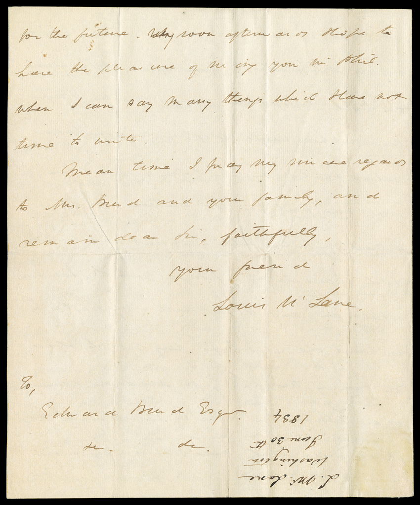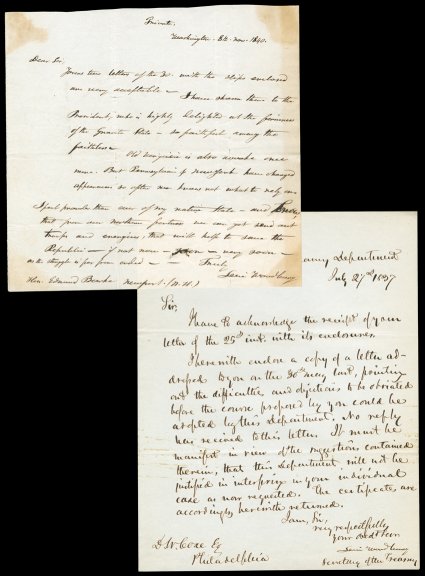October 2, 1830. He writes Nicholas Biddle, president of thSecretaries of the Treasury, 1830-41 [Jackson - Van Buren] A choice group of autographs including Manuscript Letter Signed "S.D. Ingham" as Secretary, 2/3 page, 4to, Washington, October 2, 1830. He writes Nicholas Biddle, president of the Bank of the United States, in Philadelphia: "I will thank you to inform me the names of the President & of the Officers of the Bank of the United States at Burlington and Utica". Fold wear including partial separations, overall G/VG. With ALS"Louis McLane" as Secretary of State, 3-1/2 pages, 4to, Washington, June 30, 1834. To Edward [Bird?], he says he is pleased "that the mode of my retirement from office commands your approbation. I have always entertained great doubts whether the public mind is in a state to appreciate a dignified [resignation] to preserve one's pride." He will not be one of those "party men" who feel "an obligation to submit to any means for the attainment of party ends" and "will not pardon a different feeling in any of its members." Leaving is his duty to "my character, to my past relations with the P. [i.e., Andrew Jackson], and to the character of the country..." Lightly toned, VG. McLane had resigned as Secretary of the Treasury due to differences with President Jackson over the Second Bank of the United States, which the president refused to re-charter. In compensation, Jackson named him Secretary of State, but Vice President Martin Van Buren interfered with McLane's duties and he resigned that post as well. The dispute ruined their long friendship, and there can be little doubt that Van Buren is the "party man" to whom McLane alludes. With an LS "Louis McLane" as Secretary of the Treasury, February 19, 1833, to the Collector of Customs at Newport, extending a deadline. VG. With ALS "W.J. Duane," 2/3 page, 4to, Philadelphia, February 28, 1837. He encloses a letter (not present) by DeWitt Clinton to one of the latter's admirers. Duane says Clinton was "one who was an ornament not merely to his country but to the human race. The circumstance, that I possessed the friendship of DeWitt Clinton, is one upon which I shall ever dwell with pride and delight." Some stray stains, page hinge reinforced on verso, clipping tipped to blank integral sheet, otherwise VG. With LS "W.J. Duane" as Secretary, 1/3 page, 4to, Washington, June 28, 1833. He writes Thomas Culbreth, Clerk of the Executive Council in Annapolis to inform him that he must receipt his account for copies of correspondence before the department can pay it. VG. With LS as Secretary by future Chief Justice "R.B. Taney," 1 page, 4to, Washington, May 30, 1834. He writes S.Y. Mason of Detroit that he has no appropriation for his salary due to a Senate budget deadlock, but "the amount due will be transmitted to you in a draft on the Bank of Michigan..." Paper repairs at folds on verso, otherwise VG. With LS "Levi Woodbury" as Secretary, 2/3 page, 4to, Washington, May 27, 1835. He writes US Marshal Bonsall in Philadelphia that since the Department has remitted a forfeiture without costs, "you will be pleased to pay the same as taxed by the clerk of the District Court, being $7.45..." VG. Finally, with a DS Levi Woodbury" as Secretary, 1 page, legal folio, affixing the Seal of the Treasury to a document copy signed by Register Thomas L. Smith, May 16, 1840. Mildew and soiling along left edge, otherwise Good. (imagea) (Image) Est. $750-1,000