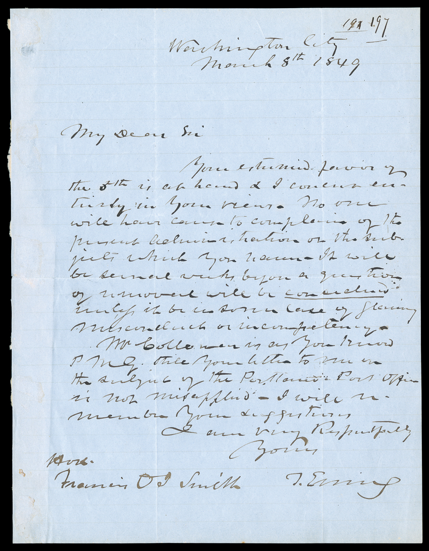 father-in-law of William T. Sherman. Manuscript Letter Signed T. EwinEwing, Thomas American politician (1789-1871); US Secretary of the Treasury; first US Secretary of the Interior; earlier, a US Senator from Ohio; foster father and later father-in-law of William T. Sherman. Manuscript Letter Signed "T. Ewing" as Secretary of the Treasury, 1 page, 4to, Washington, August 3, 1841. To N.F. Williams, Collector at Baltimore, he sends orders (not present) "to the Captain and First Lieutenant of the Revenue Cutter under your supervision...The vessel is to be withdrawn from her usual operations and placed under the orders of the Navy Department..." With and ALS "T. Ewing" as Secretary of the Interior, 1 page, 4to, Washington, March 8, 1849. In response to a letter from Francis O.I. Smith, he responds that "I concur entirely in your views. No one will have cause to complain of the present [Zachary Taylor] administration on the subjects which you name. It will be several weeks before a question of removal will be CONSIDERED unless it be in some case of glaring misconduct or incompetency. Mr. [Jacob] Collamer is as you know P[ost] M[aster] G[eneral]. Still your letter to me on the subject of the Portland Post Office is not misapplied..." Discolorations including tape marks on first letter; second letter with partial mounting strip on verso, otherwise both VG. (imagea) (Image) Est. $300-400