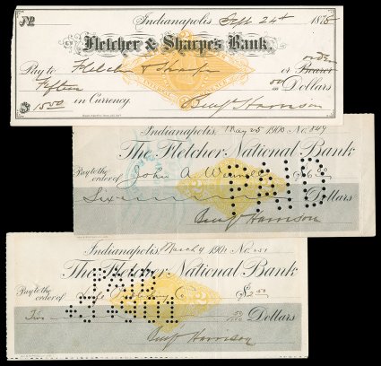 brigadier general in 1865 lawyer U.S. Senator. Choice AutographHarrison, Benjamin Twenty-third President of the United States (1833-1901, served 1889-93); grandson of William Henry Harrison; served throughout the Civil War, and was brevetted brigadier general in 1865; lawyer; U.S. Senator. Choice Autograph Document Signed "Benj. Harrison," 1 page, narrow oblong 8vo, Indianapolis, September 24, 1878. A check drawn on Fletcher & Sharpe's Bank in the amount of $15.50, payable to Fletcher & Sharpe. Imprinted with a two-cent revenue stamp (RN-G1, a beautiful shade of red). Closed spindle hole, otherwise VG. With two Documents Signed "Benj. Harrison," each 1 page, narrow oblong 8vo, Indianapolis, May 25, 1900, and March 4, 1901. Both are drawn on the Fletcher National Bank, the first to the order of John A. Wenell for $6, and the second to Life Publishing Co. for $2.50. Each with imprinted two-cent revenue stamp (RN-X7). Both with perforation cancellations not touching signatures. Mounting traces on verso of 1901 check, otherwise VG. The last of these was probably for a subscription to one of Life's publications; sadly, Harrison would have little use for it, for he would die within nine days of signing the check. With engraved portrait. (Image) Est. $500-750