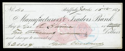 in government reforms earlier, Mayor of Buffalo and Governor of NCleveland, Grover Twenty-second and twenty-fourth President of the United States (1837-1908, served 1885-89 and 1893-97); the only president to serve non-consecutive terms; active in government reforms; earlier, Mayor of Buffalo and Governor of New York; the only Democrat sent to the White House in the fifty-six years between the elections of Buchanan and Wilson. Choice Autograph Document Signed "Grover Cleveland," 1 page, narrow oblong 8vo, Buffalo, New York, January 15, 1877. A check on the Manufacturers and Traders Bank, in the amount of $2000, payable to G.R. Haines. Imprinted on the check is a two-cent revenue stamp (RN-K8). Endorsed by Haines on verso. Cut cancellation not touching signature. Two spindle holes, otherwise VG. At the time, Cleveland, 39 years old, was still a practicing lawyer in Buffalo. His only political office had been Buffalo County Sheriff, from 1871-73. Little could he have imagined that within eight years, he would be elected to the highest office in the nation. (Image) Est. $500-750