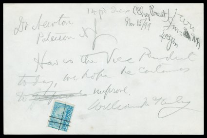 assassinated by an anarchist at the Pan-American Exposition in BuffaloMcKinley, William Twenty-fifth President of the United States (1843-1901, served from 1897); presided over the Spanish-American War, which saw the nation gain a global empire; assassinated by an anarchist at the Pan-American Exposition in Buffalo; earlier, Governor of Ohio; the last US President to have served in the Civil War. Outstanding content Autograph Note Signed "William McKinley" as President, in pencil, one page, oblong 8vo, no place (probably Washington), November 15, 1899. A telegram text written in apparent haste to Dr. Newton in Paterson, New Jersey, where he was treating Vice President Garret Hobart for heart disease. McKinley asks, "How is the Vice President today, we hope he continues to improve." A somewhat less legible version of the last word has been scribbled through. With one-cent 1898 series documentary revenue stamp with the image of a steamship (R-163), canceled in pen. With clerical notes at upper right corner. Very lightly soiled, otherwise VG. For a vice president, Hobart was unusually powerful in the McKinley administration, and was the president's close adviser and friend. As often happens, his improvement was not a sign of recovery, and he would die just six days after this telegram. McKinley was persuaded to accept Theodore Roosevelt as his running mate in the 1900 presidential election, primarily to neutralize the popular but disruptive young Republican's energetic support of political reform. The plan backfired on Republican bosses when McKinley was murdered just six months into his second term. (Image) Est. $500-750
