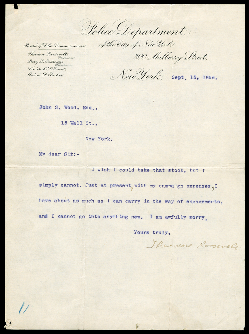 Rough Riders volunteers during the Spanish-American War acquiredRoosevelt, Theodore Twenty-sixth President of the United States (1858-1919, served 1901-09), succeeding to the presidency upon the death of McKinley; gained renown as head of the "Rough Riders" volunteers during the Spanish-American War; acquired the Panama Canal Zone and began construction on the canal; negotiated the end of the Russo-Japanese War, for which he received the Nobel Peace Prize. Good content Typewritten Document Signed "Theodore Roosevelt" while President of the Board of Police Commissioners, 1/2 page, 4to, on his official stationery, New York, September 15, 1896. To John S. Wood at 15 Wall St., he writes, "I wish I could take that stock, but I simply cannot. Just at present, with my campaign expenses, I have about as much as I can carry in the way of engagements, and I cannot go into anything new. I am awfully sorry." Clip holes at left corners, overall soiling, otherwise G/VG. With deluxe printed portrait, biography, and newspaper clippings, including one of a cartoon commemorating his death. The "campaign" upon which Roosevelt was about to embark was in support of the election of William McKinley. Roosevelt would be awarded with a position as Assistant Secretary of the Navy, which gave him one of his first opportunities to change history when he dispatched an American fleet toward the Philippines without authorization, leading directly to Dewey's victory at Manila Bay. (imagea) (Image) Est. $500-750