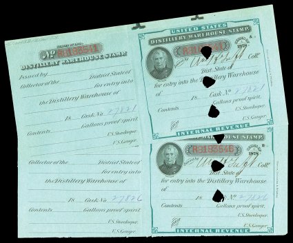 Chief Justice, U.S. Supreme Court (1921-30), the only ex-presidenTaft, William Howard Twenty-seventh President of the United States (1857-1930, served 1909-13); civil Governor of the Philippine Islands; Secretary of War under Theodore Roosevelt; Chief Justice, U.S. Supreme Court (1921-30), the only ex-president to hold that position. Rare pair of early, unaccomplished Documents Signed "Wm. H. Taft" as Collector of Internal Revenue in Cincinnati, Ohio, each one page, narrow oblong 8vo, undated, but 1882 or 1883. Distillery warehouse stamps, 1878 series, numbers R8183541 and R8183546. These were partly filled out for cask numbers 27821 and 27826 at an unnamed warehouse. Each has three punch cancellations with one punch on each touching Taft's signature, in one case just touching the "m" in "Wm." and in the other partly removing the "m" in "Wm." and Taft's middle initial. Otherwise both are VG. At the time he signed these stamps, Taft was still a bachelor under age thirty, and also worked as an assistant district attorney. These are the oldest Taft documents we have handled, and we know of only one other of this age sold in the past twelve years. (Image) Est. $400-500