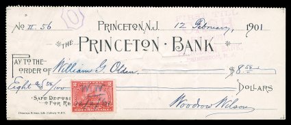 Republican vote conceived the League of Nations but was unable to gWilson, Woodrow Twenty-eighth President of the United States (1856-1924, served 1913-21); gained the White House when Taft and third-party candidate Theodore Roosevelt split the Republican vote; conceived the League of Nations but was unable to gain Senate approval for American membership; earlier, Governor of New Jersey and president of Princeton University; awarded the Nobel Peace Prize in 1919. Uncommon early Autograph Document Signed "Woodrow Wilson" while a professor of law and political economy at Princeton University, 1 page, narrow oblong 8vo, Princeton, NJ, February 12, 1901. A check drawn on the Princeton Bank in the amount of $8.52, payable to William G. Olden. Bears a 2-cent 1898 series (R164) Revenue Stamp Signed "W.W. / 02/2/01" by Wilson. With Olden's endorsement signature on verso. Handstamp and cut cancellations not affecting signature. Very light bleeding of payee's name, mounting traces on verso, otherwise VG. In 1902, Wilson would be elected president of the university, serving until 1910, when he ran successfully to become governor of New Jersey. Olden is a famous name in Princeton, and a namesake of the William Olden paid by this check purchased in 1696 the land where now stands the New Jersey governor's mansion, Drumthwacket. (Image) Est. $750-1,000