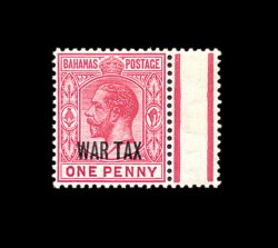 #MR7a, 1918 1 Carmine rose with "War Tax" overprint, watermarked sideways, right gutter-margin mint single, extraordinarily well centered, bright sumptuous color, o.g., lightly hinged, extremely fine; a far scarcer variety than its modest catalog value implies (S.G. #97a; £350).
