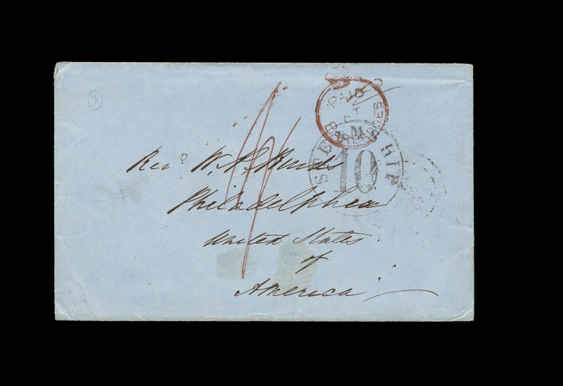 #A1, "Paid at Barbadoes" Crowned Circle handstamp, on the front of very neat 1853 cover to the United States, black "Steamship/10" on arrival, on the reverse "Barbadoes/JU 11 1853" double-arc c.d.s. and similar St. Thomas transit, an unusually well struck example of this paid frank, very fine