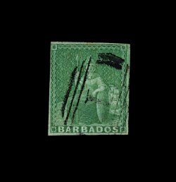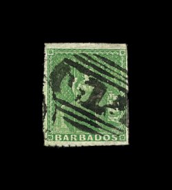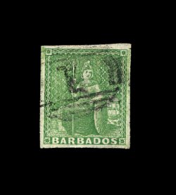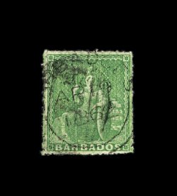 #12, 1859 (1/2p) Pale yellow green, pin-perforated 12 1/2, used single with very light numeral "1" cancel plus a central nearly full strike of less commonly seen "Barbadoes/AP 19/1862" double-arc c.d.s., stamp is very well centered with virtually full perforations all around, quite uncommon o