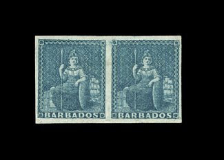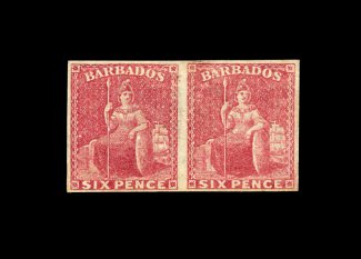 #57e, 1878 "1D." S.G. Type A and C surcharges on half 5/- Dull rose, unsevered pair, surcharges reading down, used with "Barbadoes/MR 29 78" c.d.s. one day after issuance, strong color, centered just into frame at top and light thinning at top, still of fine appearance; despite this being the