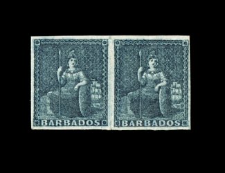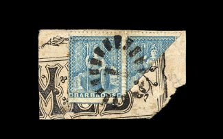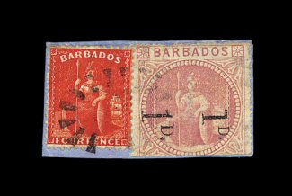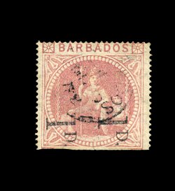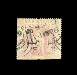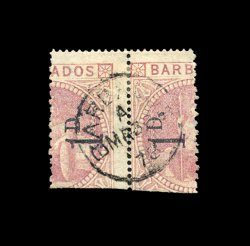 #59a, 1878 "1D." S.G. Type C surcharge on half 5/- Dull rose, unsevered pair, surcharge reading down, used example with portions of "Barbadoes/SP 9 1878" double-arc c.d.s., a cancel not often seen on these provisionals, color somewhat faded and small stain in right stamp, otherwise fine and t